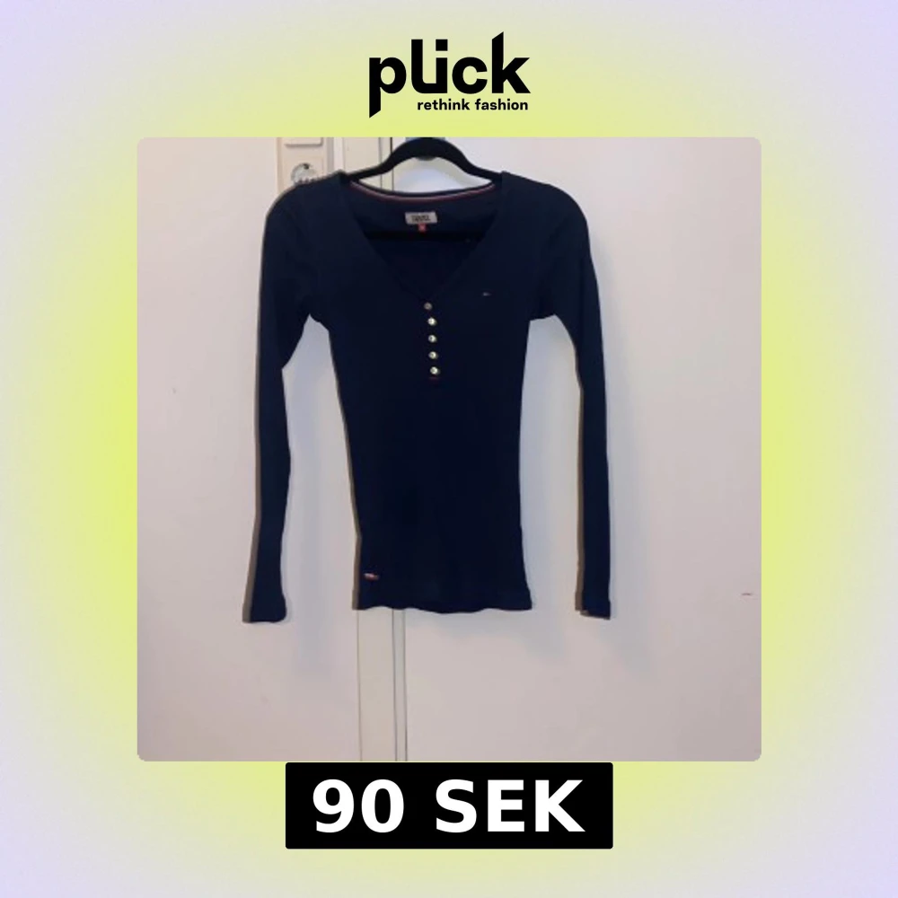 Säljer en mörkblå långärmad topp från Tommy Jeans med v-ringning och knappar framtill. Tröjan är ribbad och har små logodetaljer vid bröstet och nederkanten. Perfekt för en stilren och enkel look.