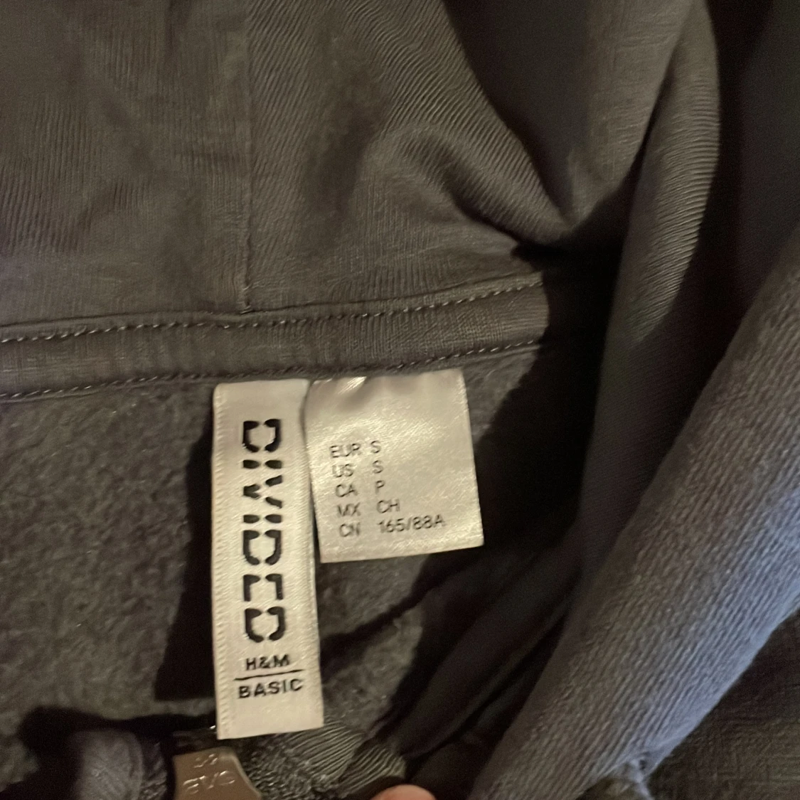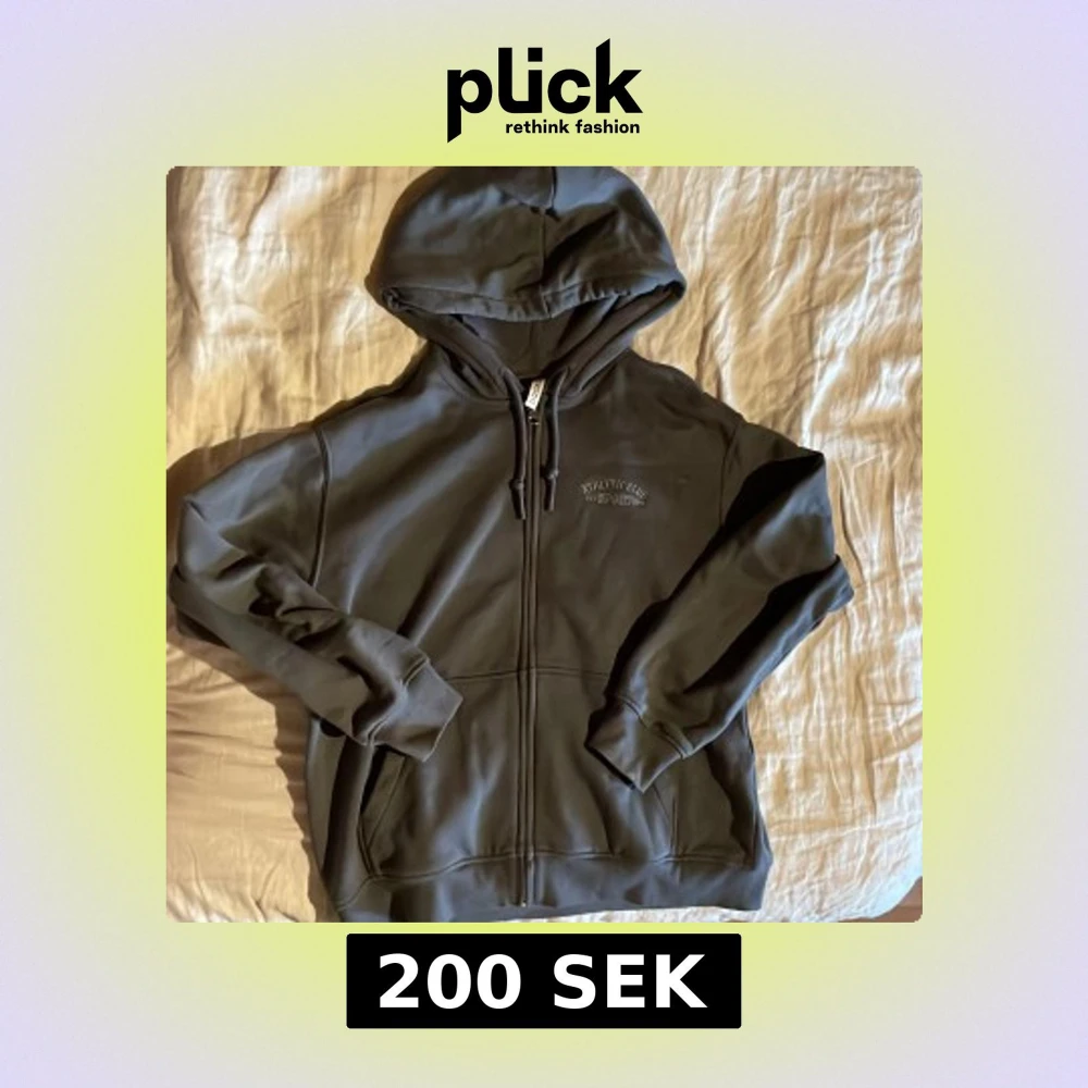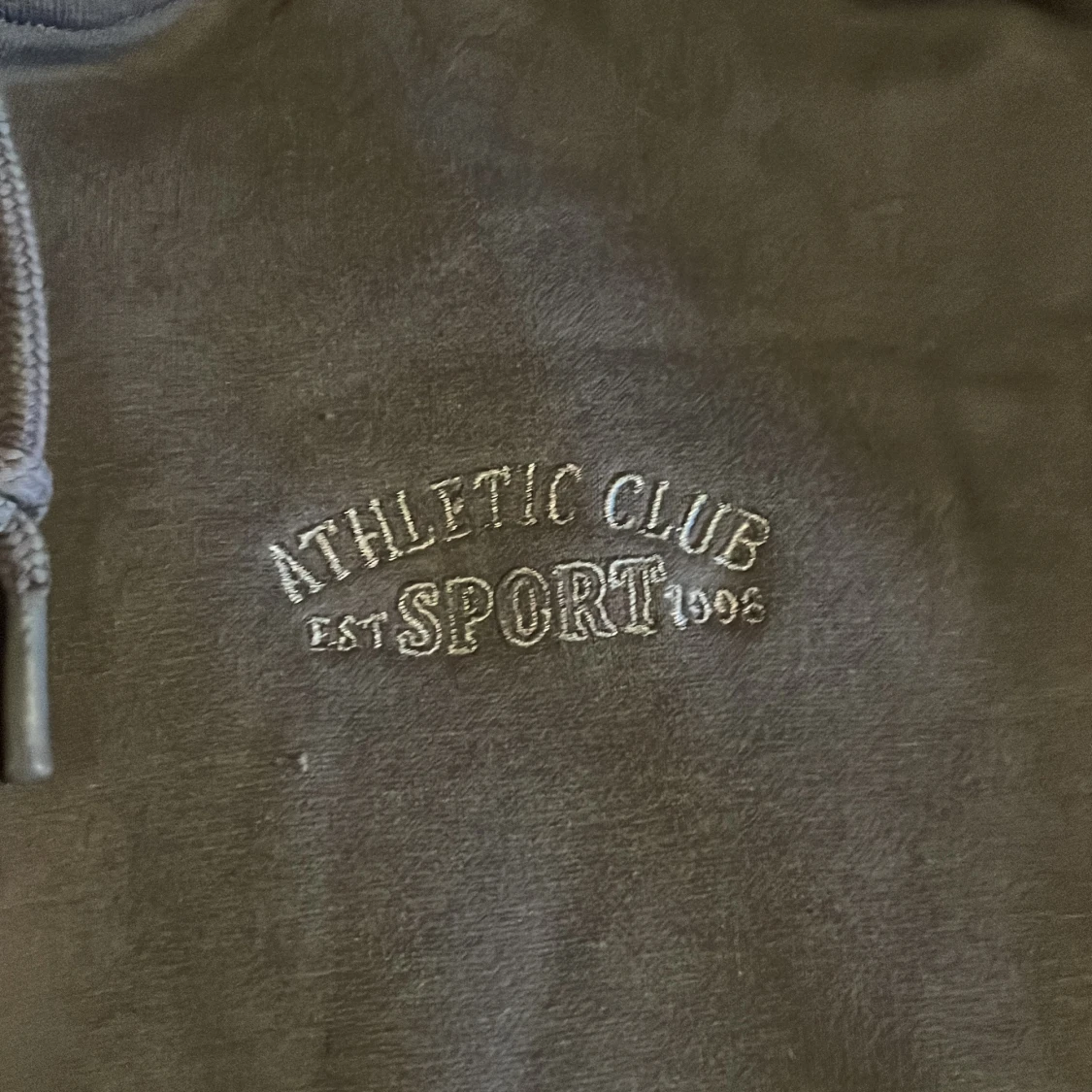 Säljer en mörkgrå hoodie från H&M Divided med dragkedja och huva. På bröstet finns broderad text 'ATHLETIC CLUB SPORT EST 1996'. Perfekt för en avslappnad stil.
