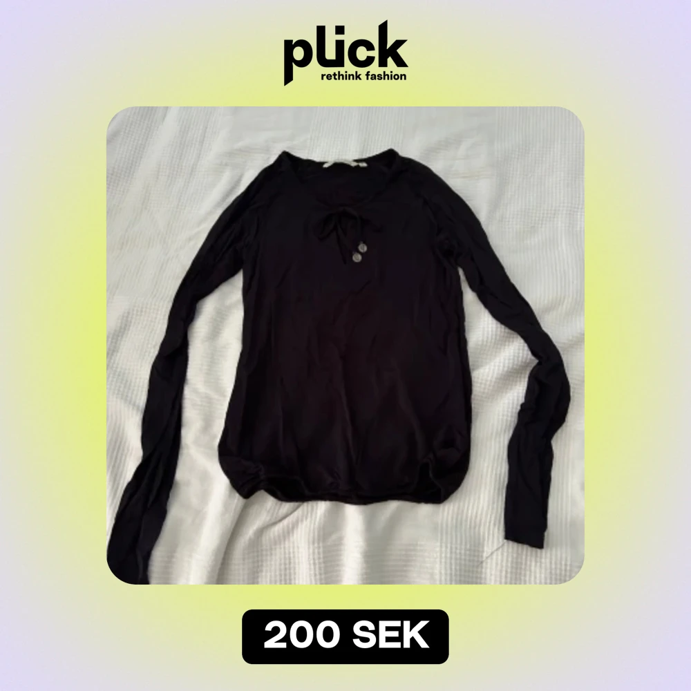 Säljer en stilren svart långärmad tröja från House of Lola. Tröjan har en söt knytning vid halsen och två dekorativa knappar framtill på snörena.