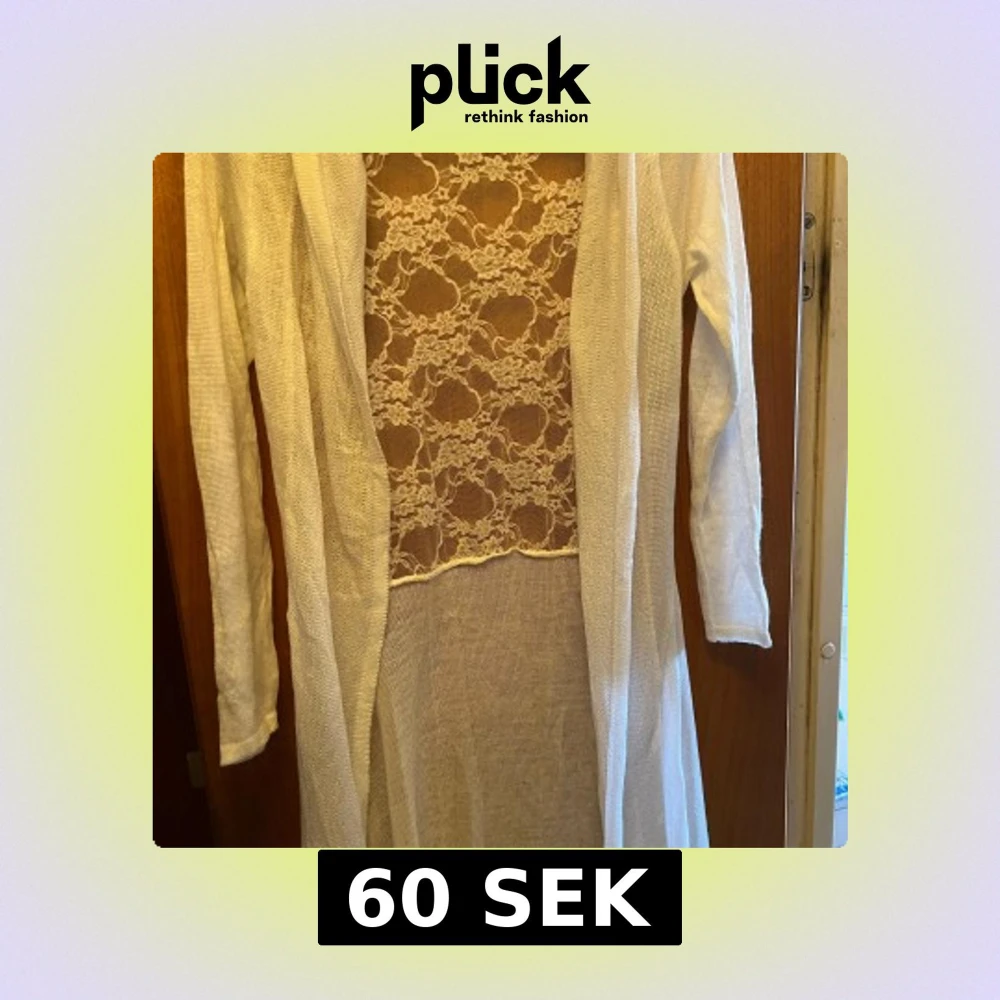 Säljer en vit långärmad kofta från Elitzia med transparent spetsdetalj över rygg. Koftan har ett elegant blommigt spetsmönster och är tillverkad i ett tunt, stickat material. Perfekt för dig som gillar romantiska detaljer. Använd 1 gång.