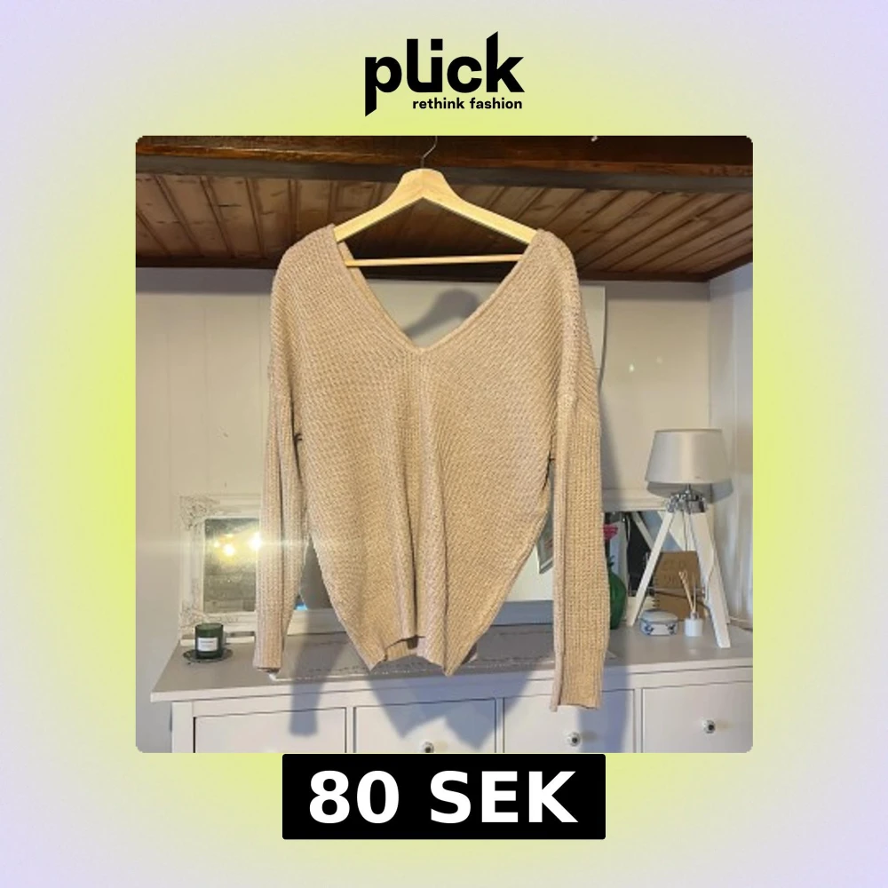 Säljer en mysig beige stickad tröja från Shein. Tröjan har en v-ringad design och långa ärmar. Den är i storlek S. Helt oanvänd, råkade köpa två.
