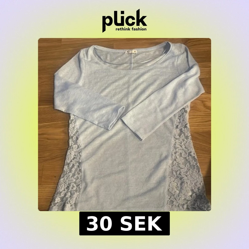 Säljer en ljusblå långärmad topp från C i storlek XS. Toppen har fina spetsdetaljer längs sidorna och är tillverkad i ett tunt, mjukt material. Perfekt för dig som gillar feminina detaljer och enkel stil.