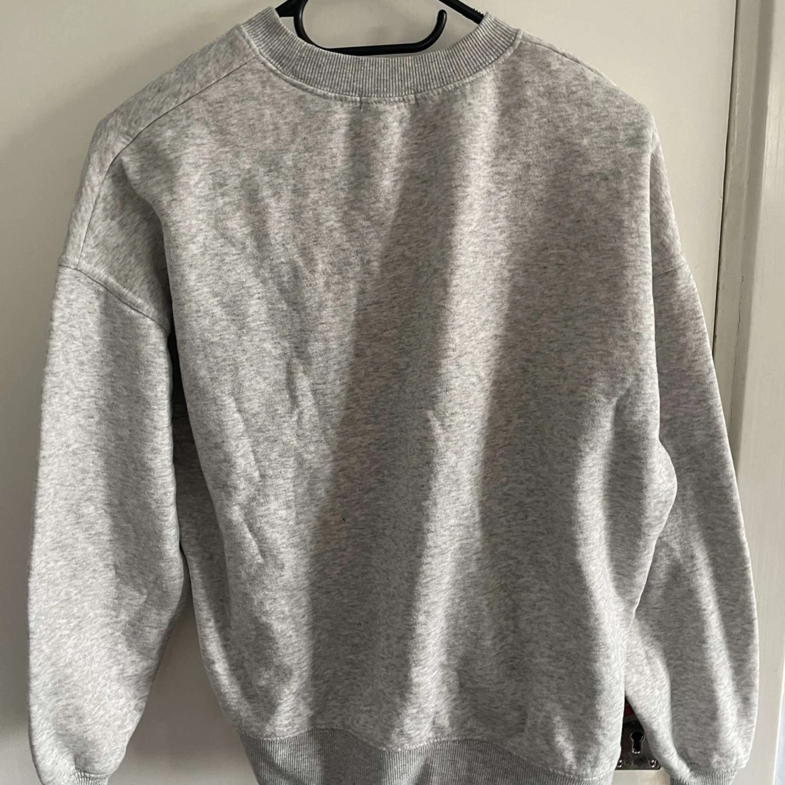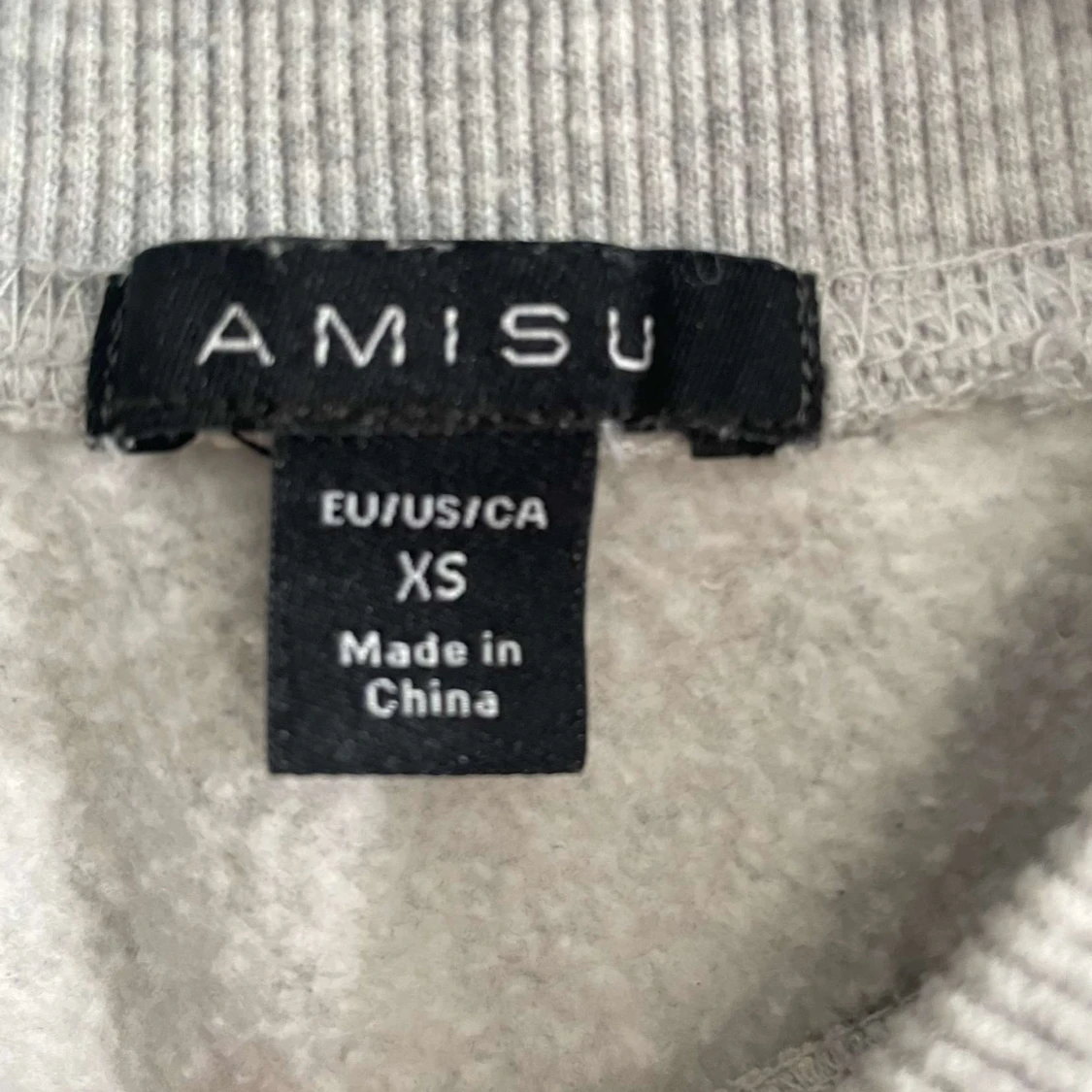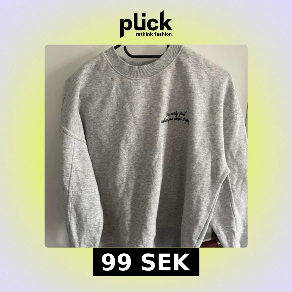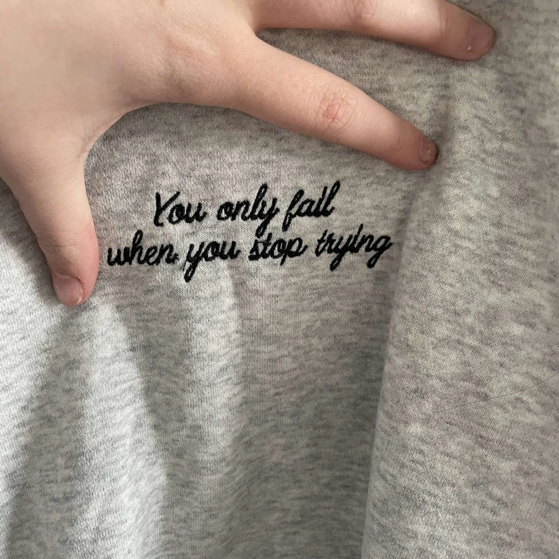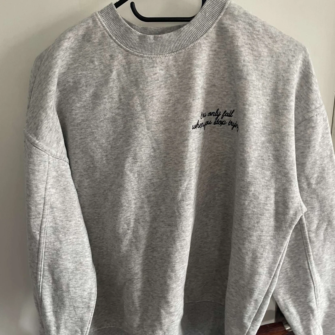 Säljer en ljusgrå sweatshirt från Amisu i storlek XS. Tröjan har rund halsringning och svart broderad text på bröstet: 'You only fail when you stop trying'. Perfekt för en avslappnad stil.
