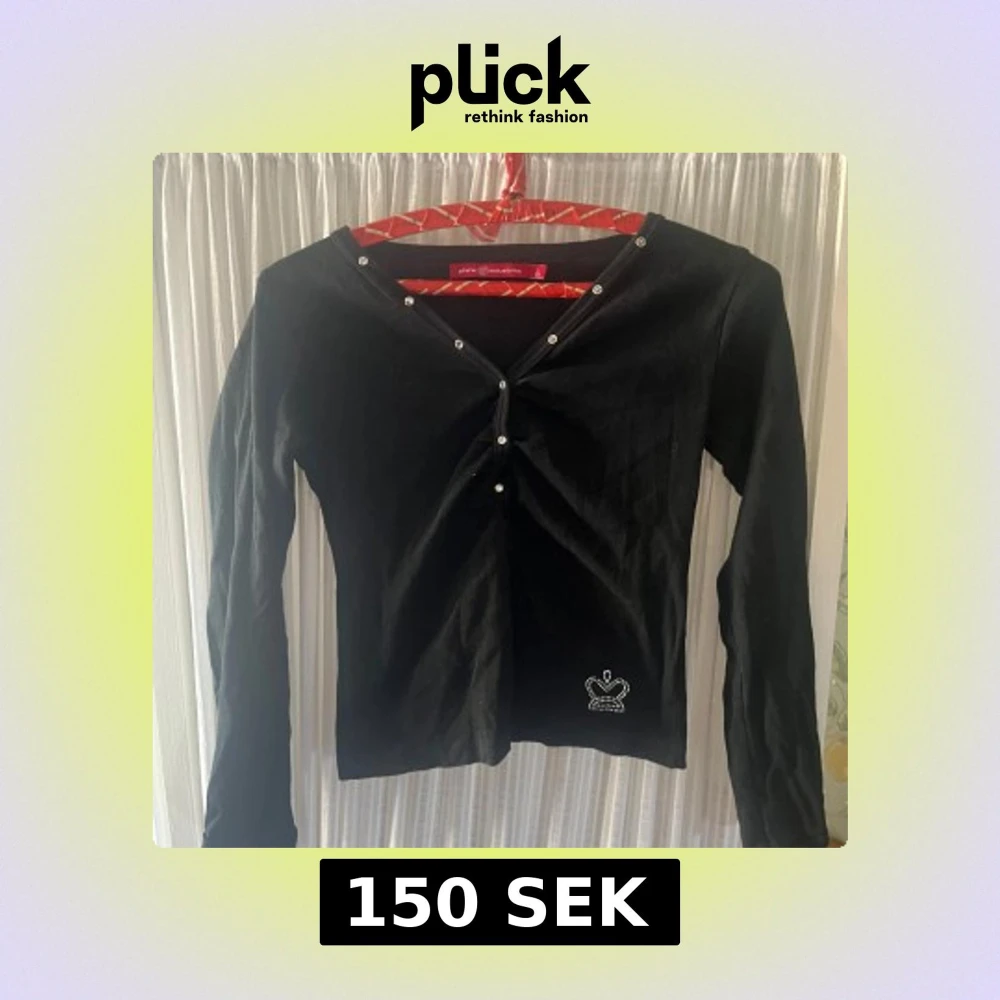 Svart långärmad top med v-ringning och dekorativa knappar framtill. Liten krona i strass nertill på ena sidan. Perfekt för en stilren och trendig look.