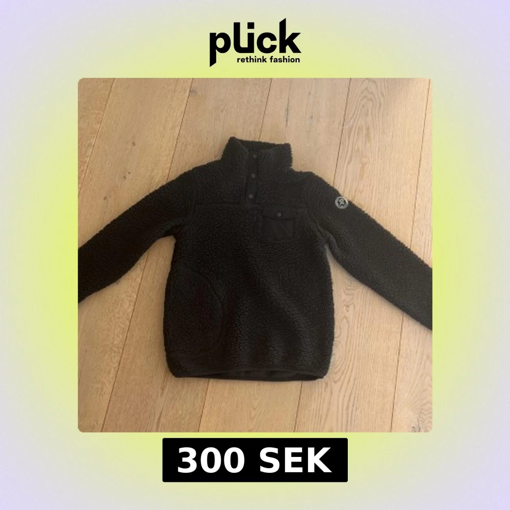 Mysig svart/mörkblå fleece tröja från Pelle P med hög krage och knappar framtill. Tröjan har en praktisk bröstficka med knapp och en rund logga på ärmen. Perfekt för kyliga dagar!