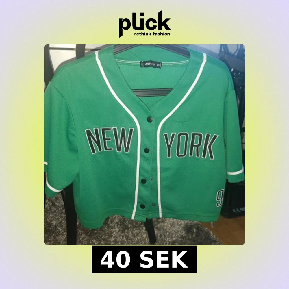 Säljer en grön baseballtröja från FB STER med texten 'NEW YORK' framtill och siffran 92 på ärmen. Tröjan har korta ärmar, knappar framtill och vita detaljer längs kanterna. Perfekt för en sportig look!