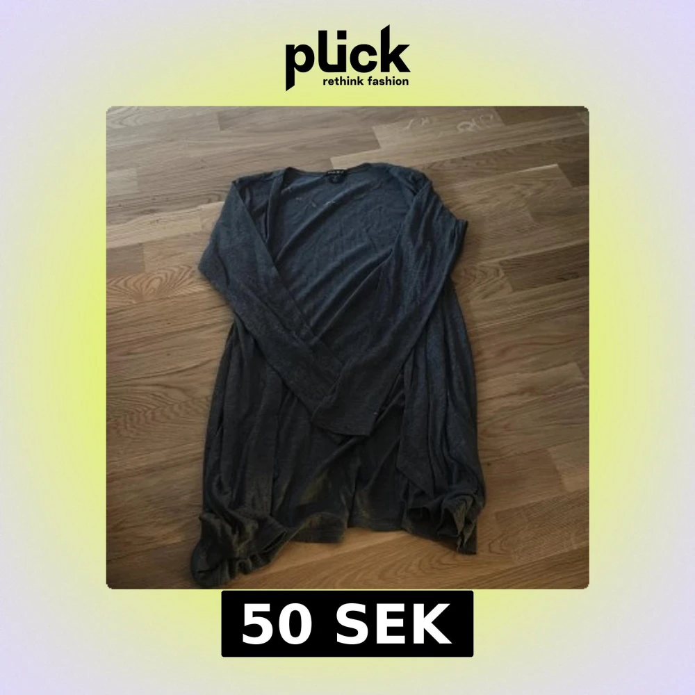 Säljer en tunn och mjuk mörkgrå kofta från Amisu. Koftan har lång ärm och är öppen framtill utan knappar eller dragkedja. Perfekt att slänga över en topp för en avslappnad look.