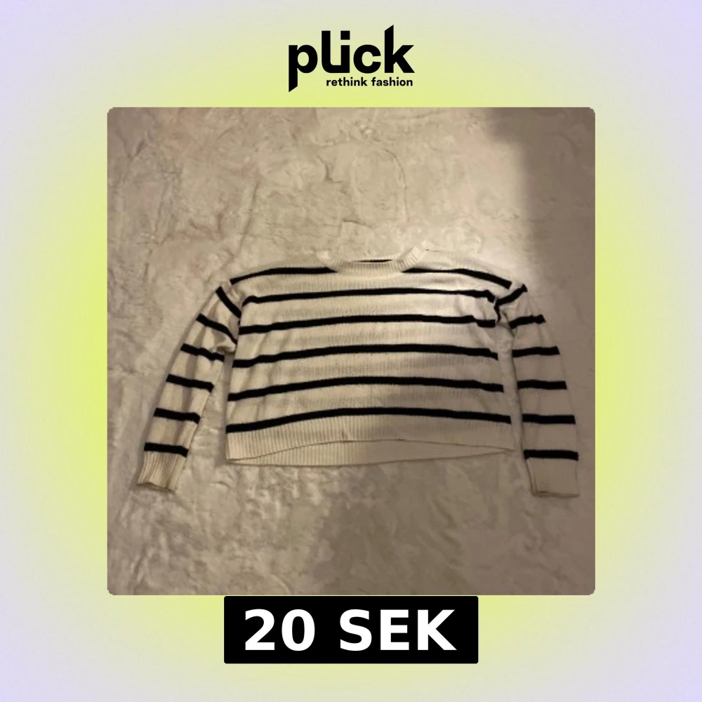 Säljer en stilren vit tröja med svarta ränder från Shein som är stickad. Tröjan har långa ärmar och är tillverkad i ett mjukt material