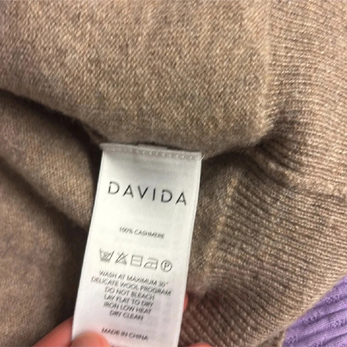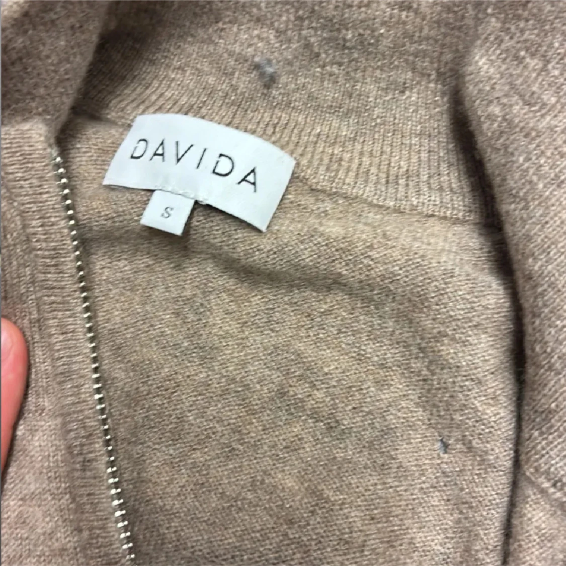 Säljer en mjuk och stilren beige kashmirtröja från Davida. Tröjan har en dragkedja framtill och långa ärmar. Perfekt för kyliga dagar och ger en lyxig känsla. Passar bra till både jeans och kjol. Tröjan har 4 defekter på sig, men de syns knappt. Köptes i vintras, nypris 2800kr