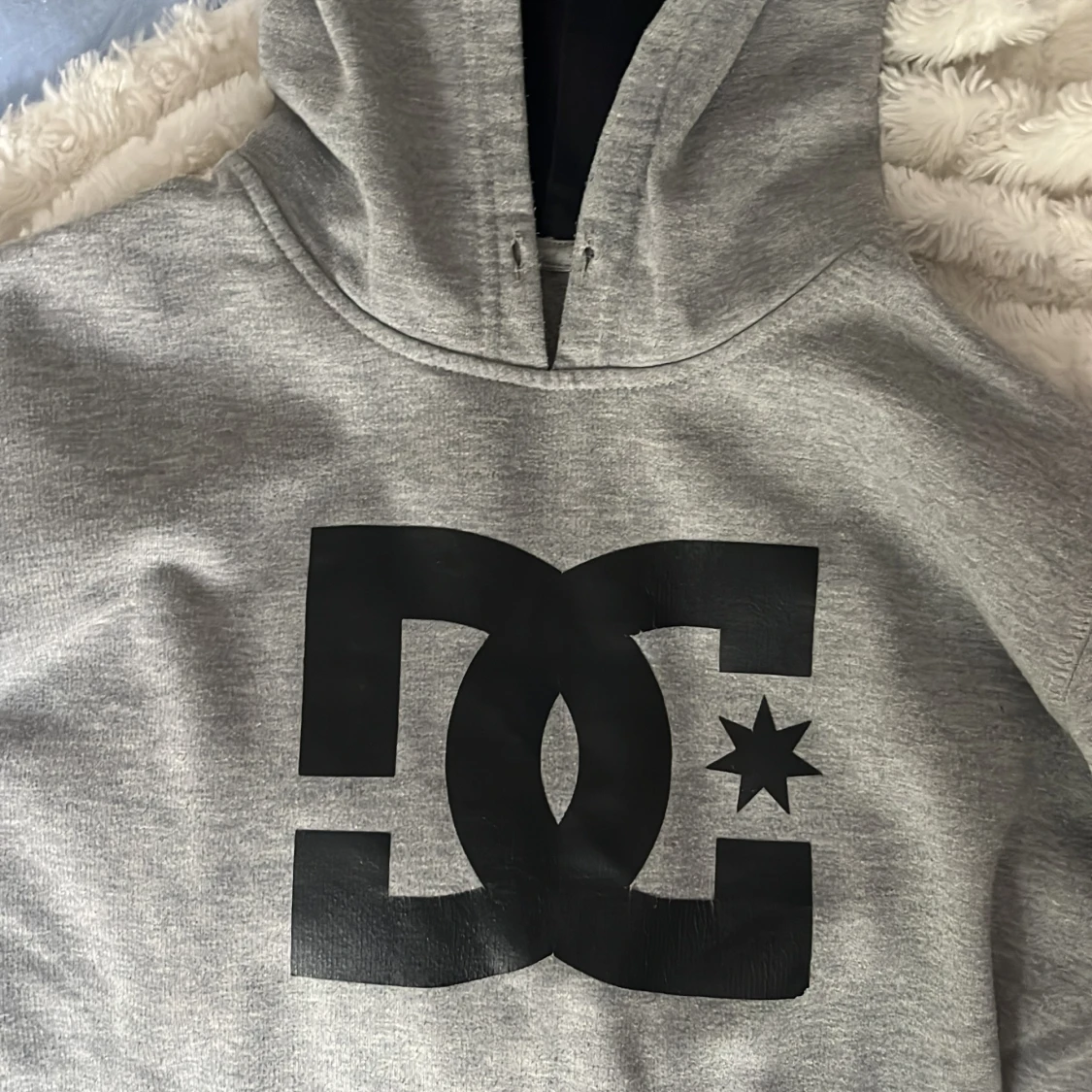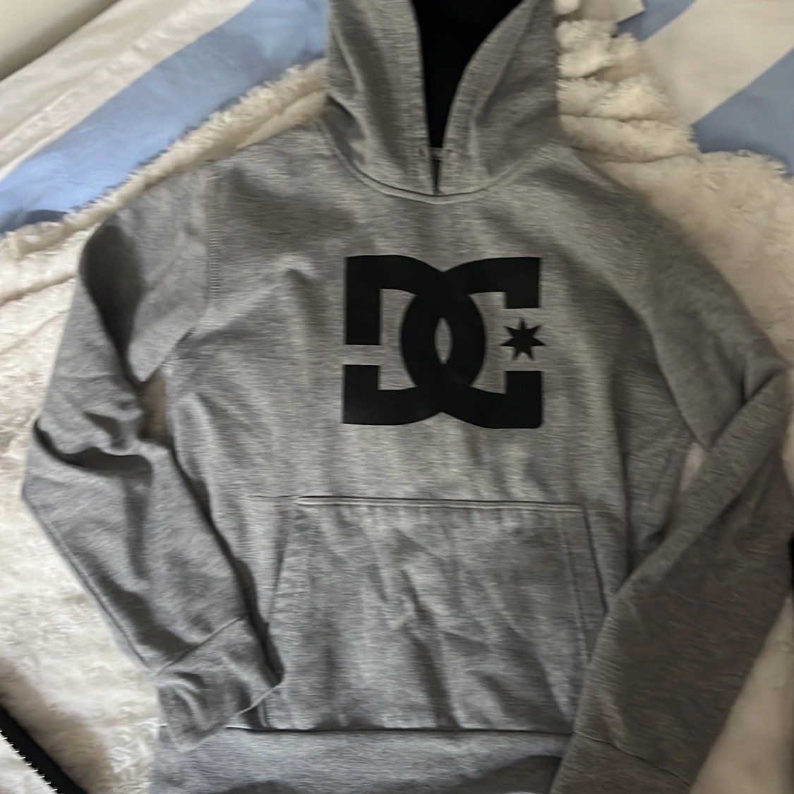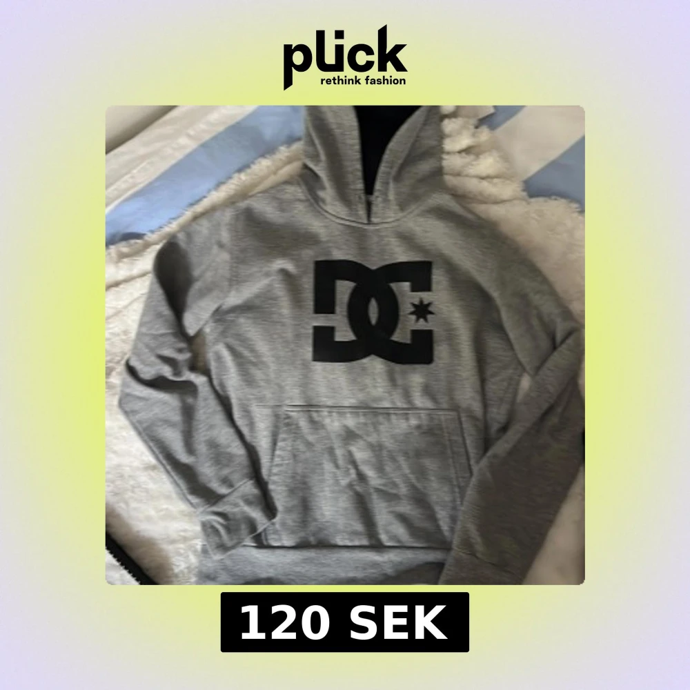 Säljer en grå hoodie från DC med stor svart logga på bröstet. Tröjan har huva, magficka och långa ärmar. Perfekt för chill dagar och streetwear-stil. Materialet är mjuk bomull och polyesterblandning som känns skönt mot huden. Har ett litet hål(se bild)
