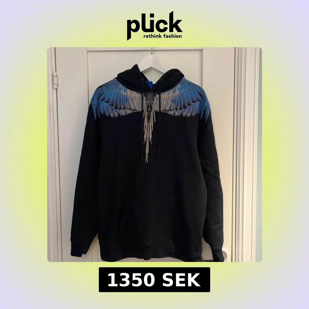 Tjenare, säljer nu en riktigt snygg svart hoodie från Marcelo Burlon med ett coolt vingmönster i blått och vitt över axlarna. Den har en liten längre passform med långa ärmar, vilket gör att den passar S/M. Skick 8/10 smått tecken på användning samt lite hårig, men annars inga problem.