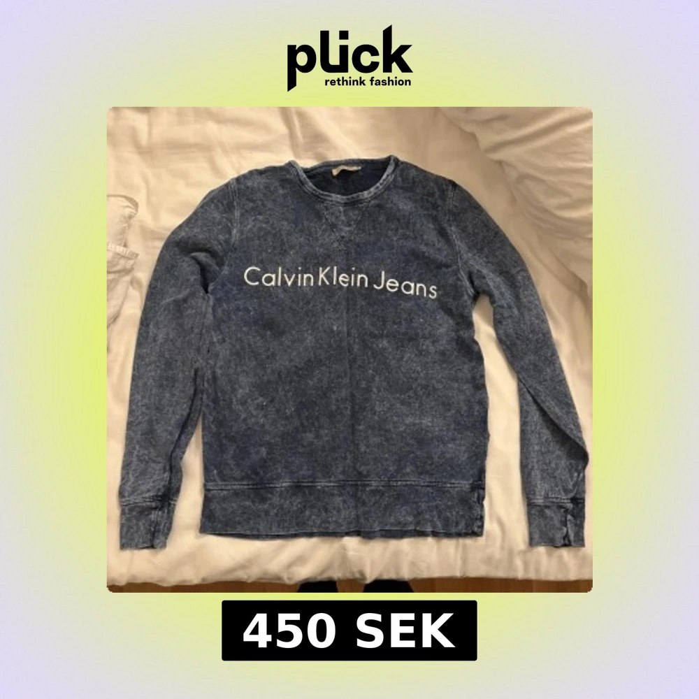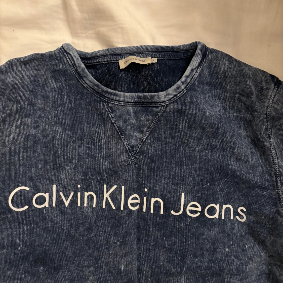 Säljer en snygg blå tröja från Calvin Klein Jeans med tryck framtill. Tröjan har långa ärmar och en avslappnad passform, perfekt för en casual look. Den är tillverkad i ett mjukt material som känns skönt mot huden.