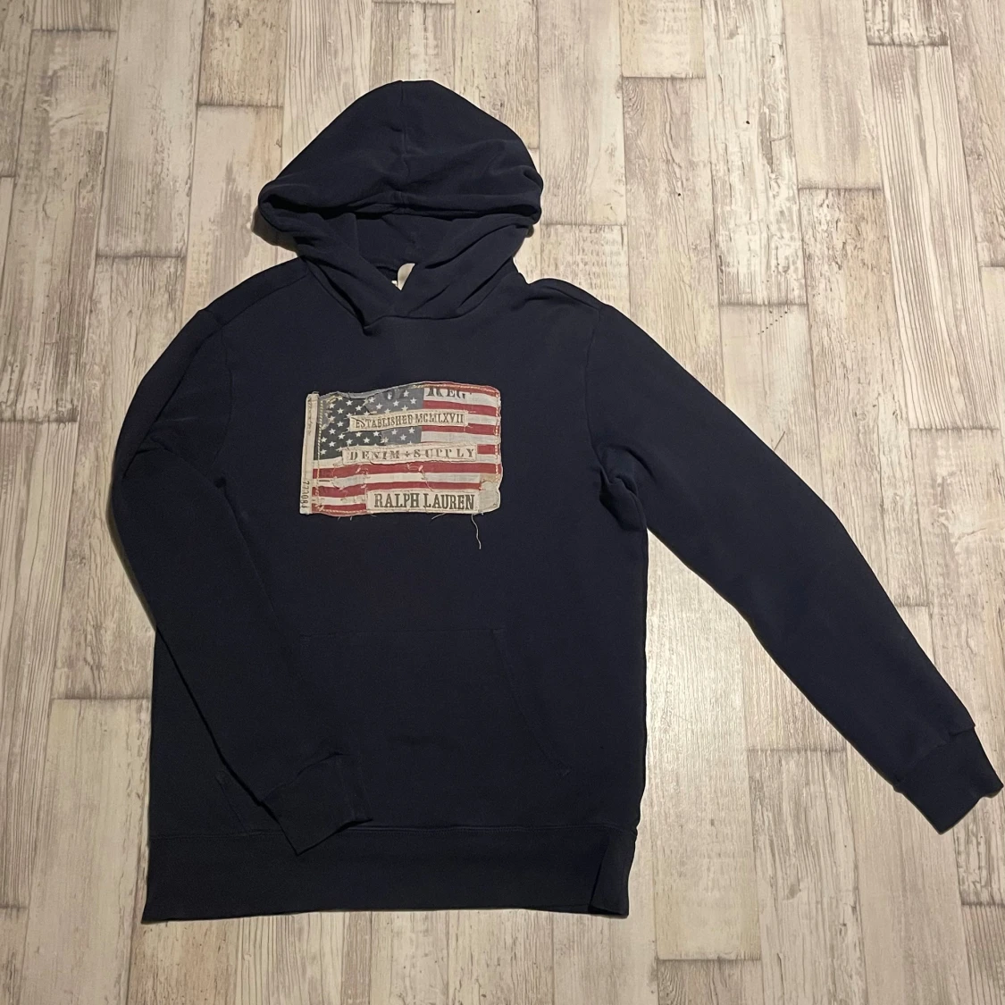 Väldigt eftertraktad hoodie från Ralph Lauren Denim & Supply med amerikansk flagga tryckt på bröstet. Tröjan har huva och är tillverkad i 100% bomull. Perfekt för en avslappnad stil. !(Storlek S men sitter som M)!
