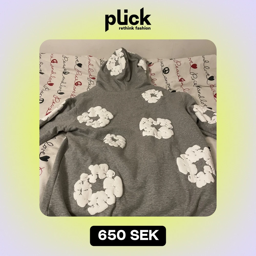 Säljer en supermysig grå hoodie med vita blommor över hela tröjan. Perfekt för att hålla sig varm och stilren under kyliga dagar. Den har en klassisk passform med en stor ficka fram och en bekväm huva. Perfekt för både vardag och chill.