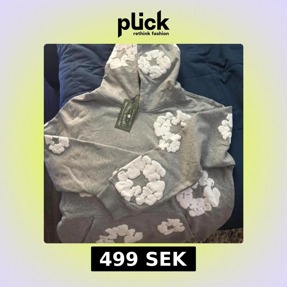 Säljer en grå hoodie från Denim Tears med stora vita blommor tryckta över hela tröjan. Hoodien har huva, magficka och långa ärmar med ribbade muddar. Perfekt för dig som gillar streetwear och vill sticka ut med ett unikt mönster.