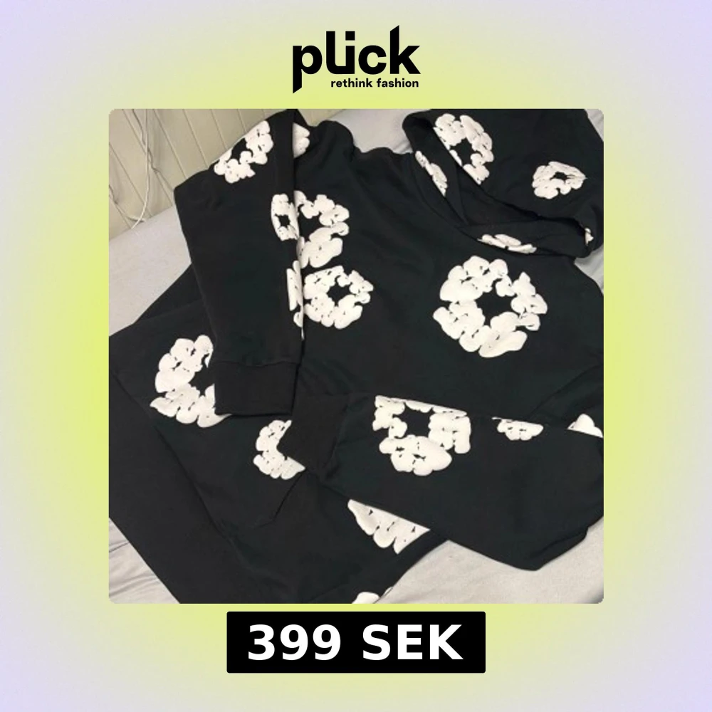 Säljer en svart hoodie från Denim Tears med vita blommönster. Den har en klassisk passform med huva och långa ärmar. Perfekt för en avslappnad stil.