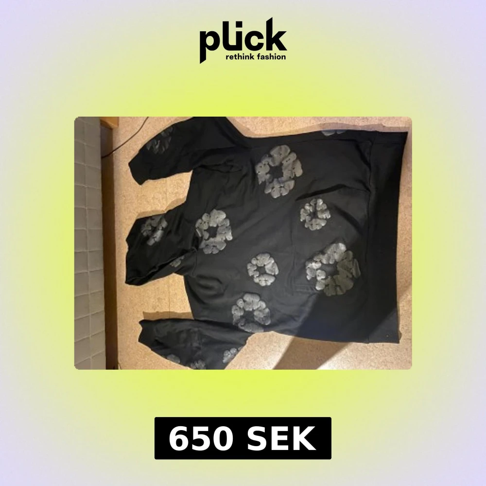 Svart hoodie från Denim Tears i storlek L med unikt grått mönster över hela tröjan. Hoodien har huva, ribbade muddar och ett coolt tryck som ger streetwear-vibe. Materialet är mjukt och känns som bomull, perfekt för dig som gillar statement-plagg.
