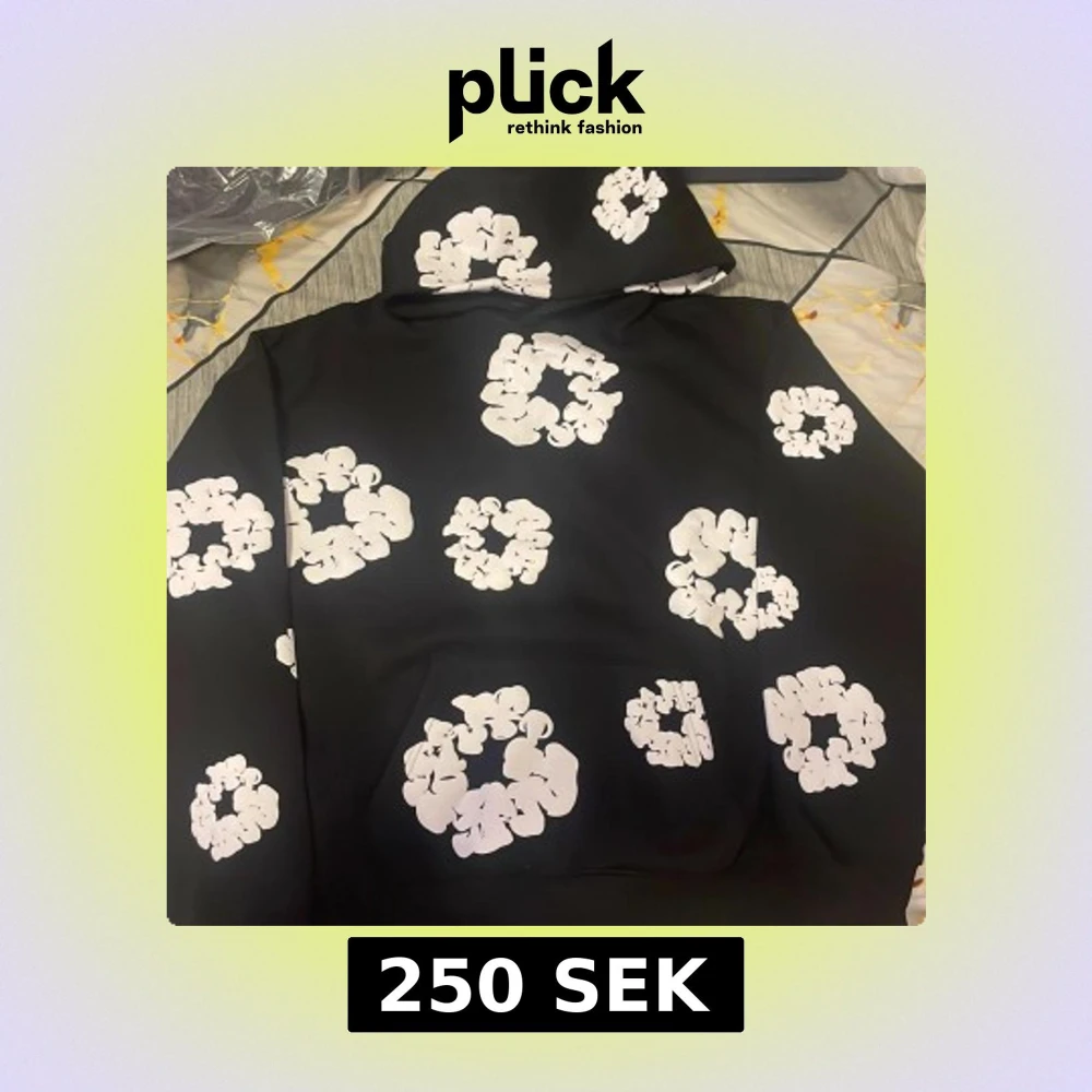Svart hoodie från Denim Tears med stora vita blommönster över hela tröjan. Klassisk huva och känguruficka framtill. Snygg och unik streetwear-stil som sticker ut i mängden.