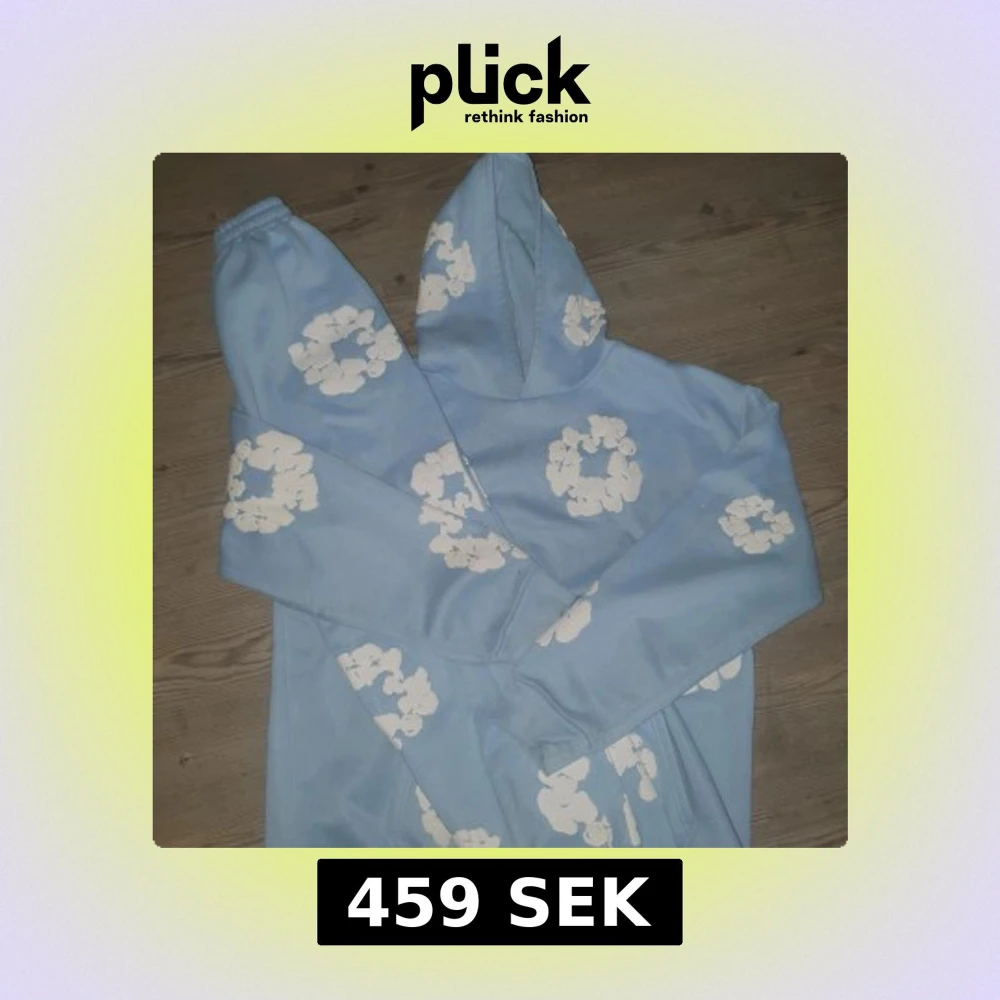 Säljer en ljusblå hoodie från Denim Tears med vita blommiga tryck över hela tröjan. Hoodien har huva, känguruficka och ribbade muddar. Materialet är mjukt och fleecefodrat, perfekt för chill dagar. Passformen är loose och ärmarna är långärmade.