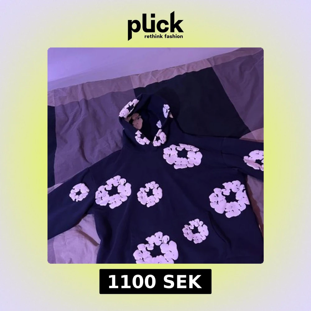 Svart hoodie från Denim Tears med stora vita blommiga tryck över hela tröjan och huva. Tröjan har en klassisk känguruficka framtill och ribbade muddar vid ärmslut och nederkant. Perfekt för dig som vill sticka ut med en unik och trendig stil. Använd 2-3 gånger!!!!! Fortfarande i nyskick. Mörkblå!