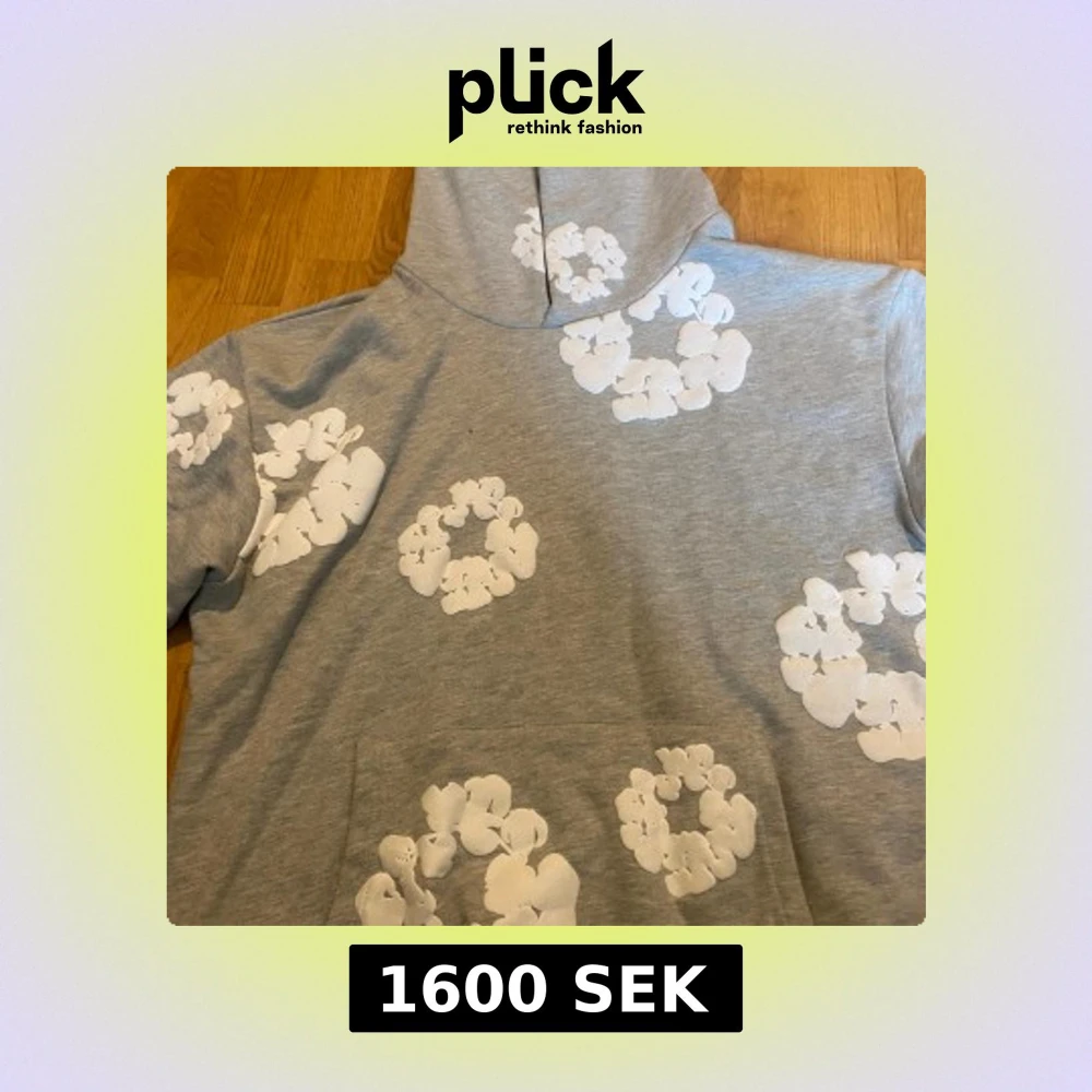 Säljer en grå hoodie från Denim Tears i 100% bomull. Tröjan har vita blommiga tryck över hela plagget och en stor huva. Perfekt för dig som gillar streetwear och vill sticka ut med en unik design.