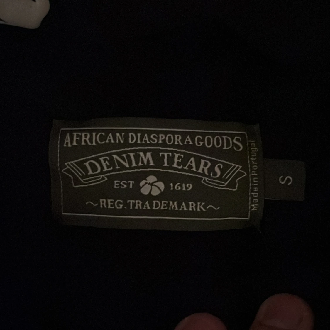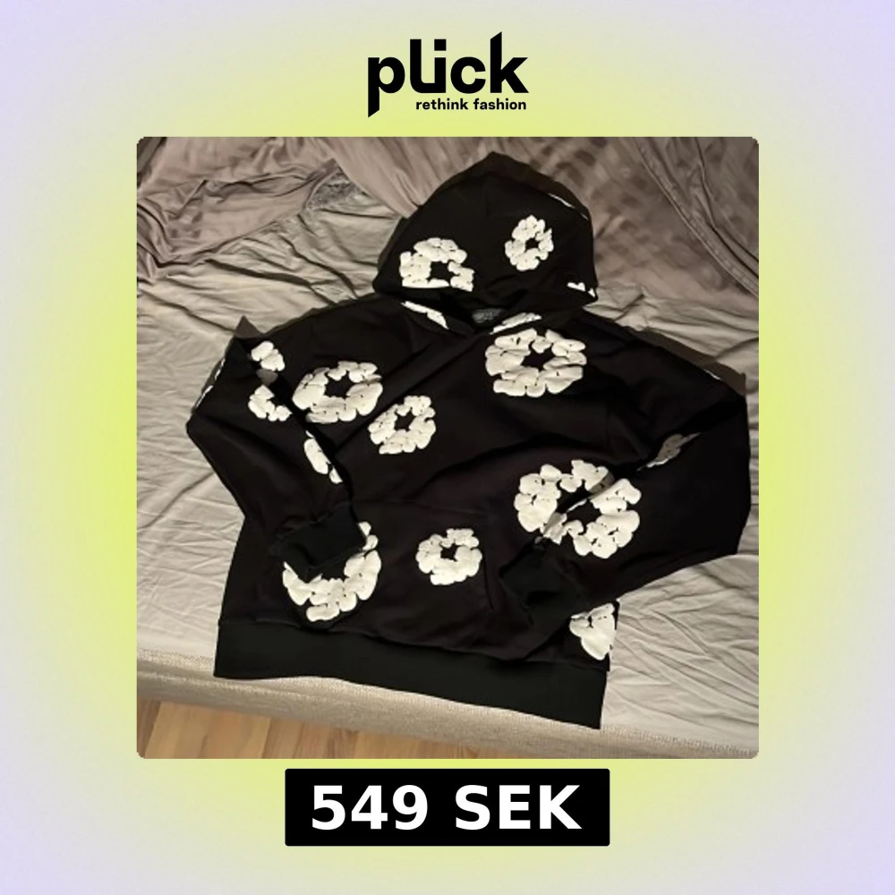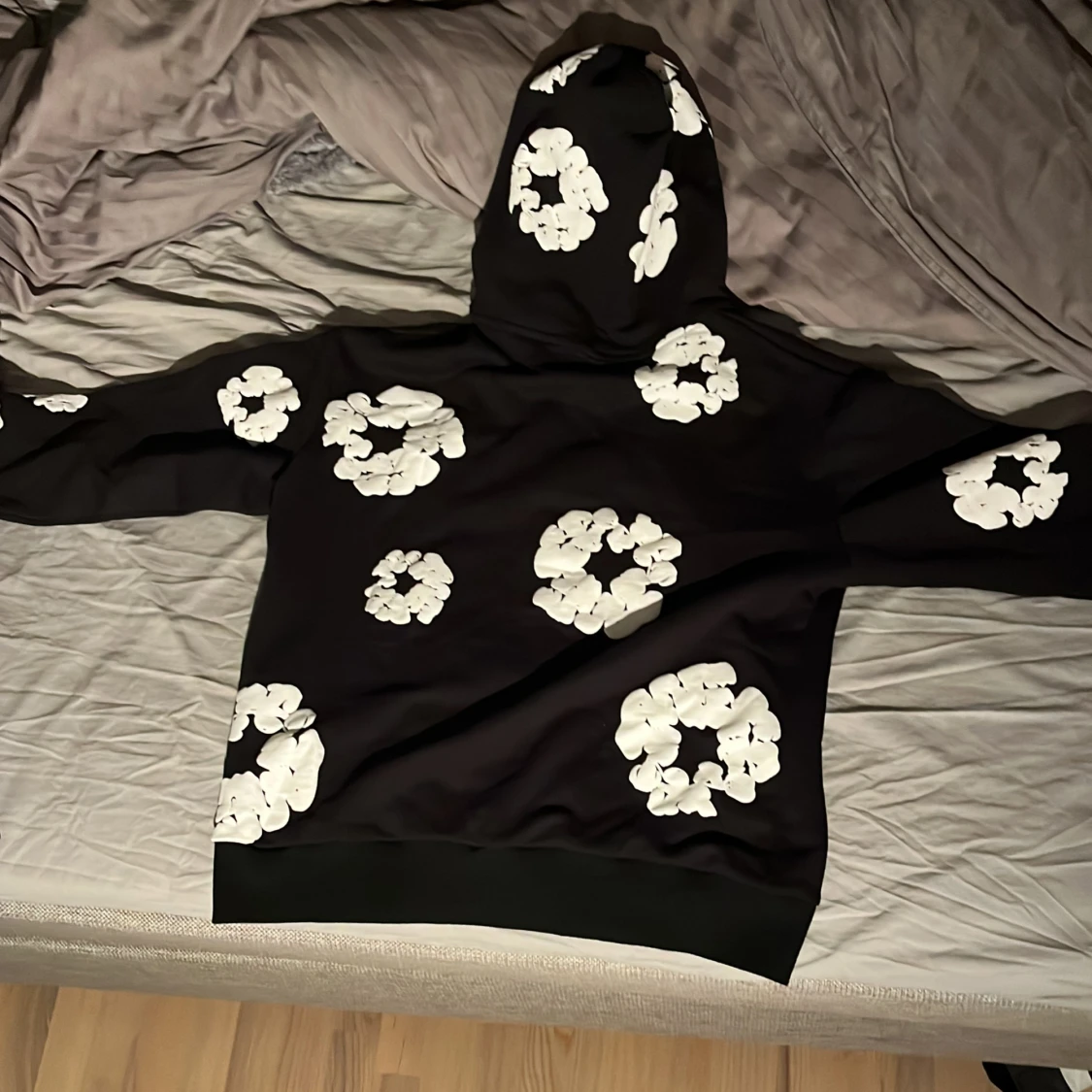 Svart hoodie från Denim Tears med stora vita blommor tryckta över hela tröjan. Tröjan har huva, långa ärmar och ribbade muddar.