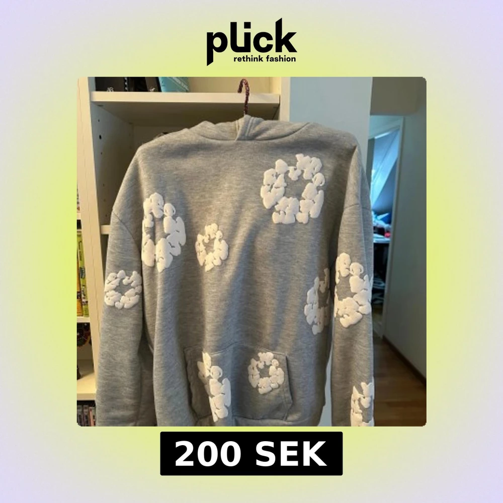 Grå hoodie från Denim Tears med vita, fluffiga blomliknande tryck över hela tröjan. Tröjan har huva, magficka och snörning i nederkanten. Mjuk insida i fleece och relaxed fit. Tröjan är på insidan customizad med ett snöre som gör den möjlig att justera till önskad fit!