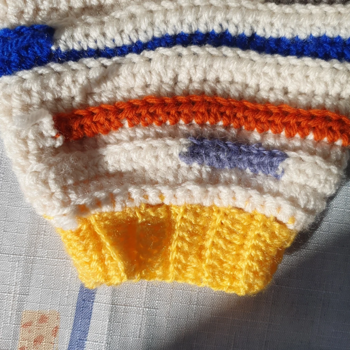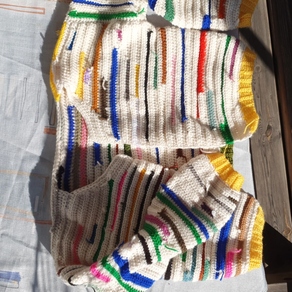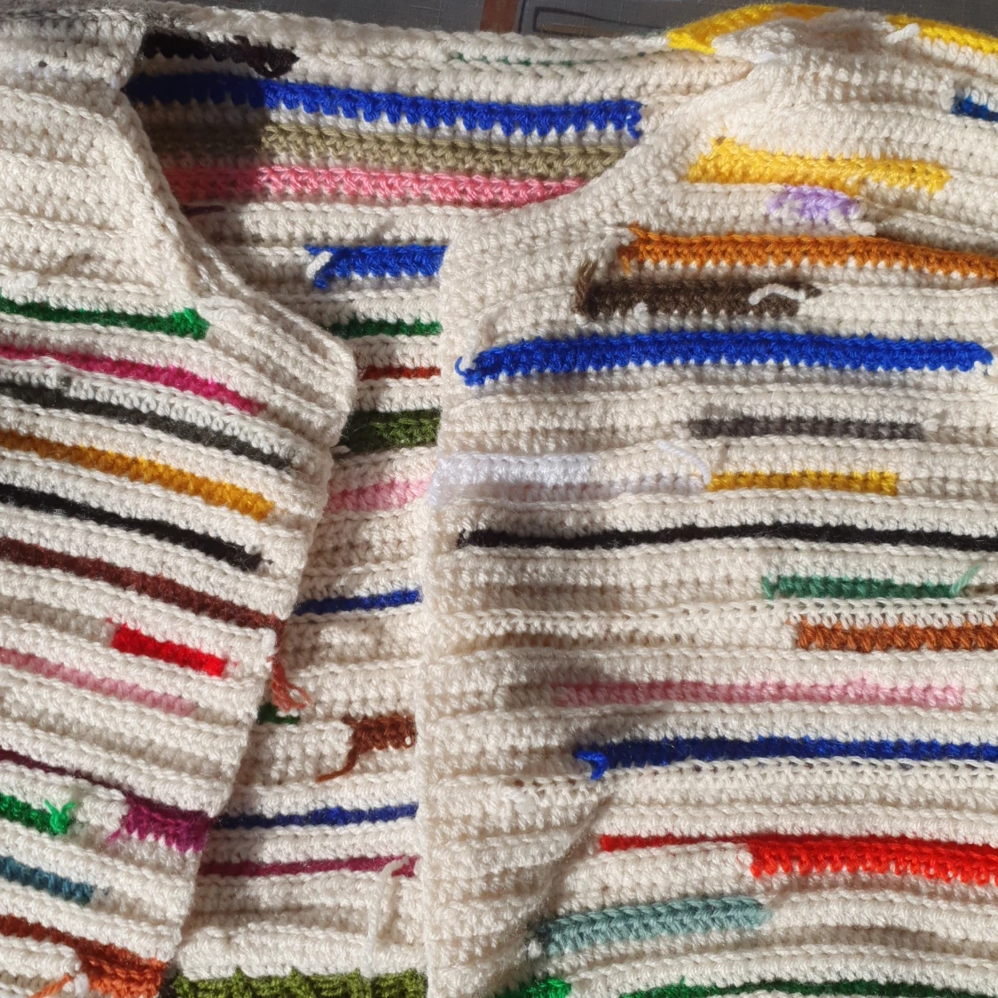 Vill se om intresset finns för denna typen av handvirkade koftor. Koftorna görs av garnrester som köpts på secondhand och virkas för hand av mig. Just denna är i en boxig, croppad modell med rund hals. Koftorna kan ha ribbad kant med knappar om så önskas