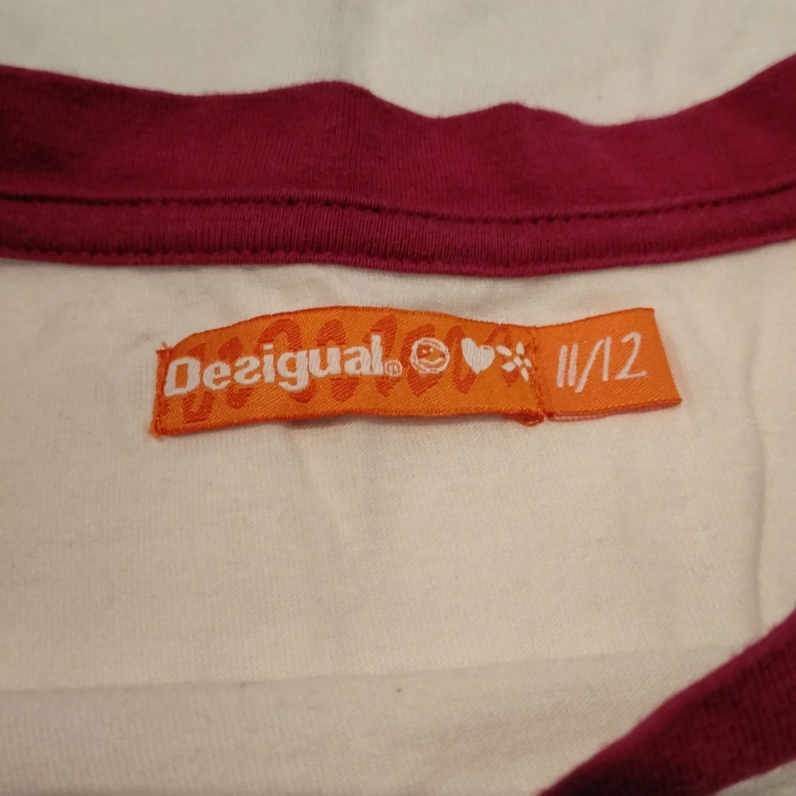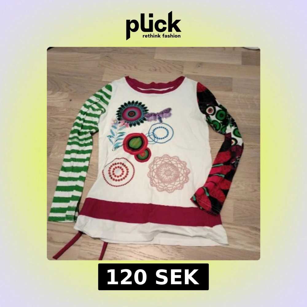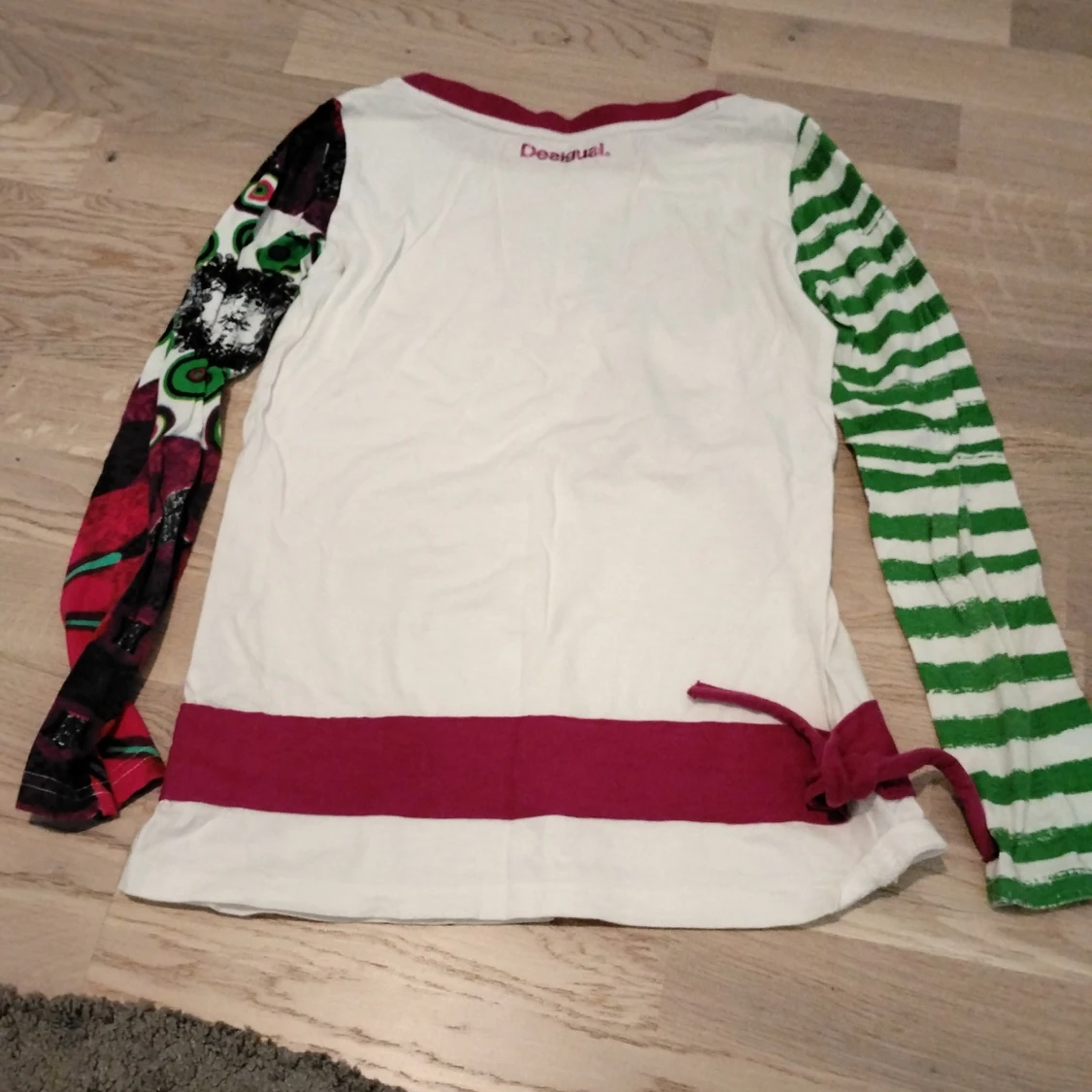 Färgstark långärmad tröja från Desigual med unika mönster och tryck framtill. Ena ärmen är grön- och vitrandig, den andra har färgglada cirklar och rött mönster. Tröjan har vinröda detaljer vid hals och nederkant samt knytband i sidan. Perfekt för dig som gillar att sticka ut.
