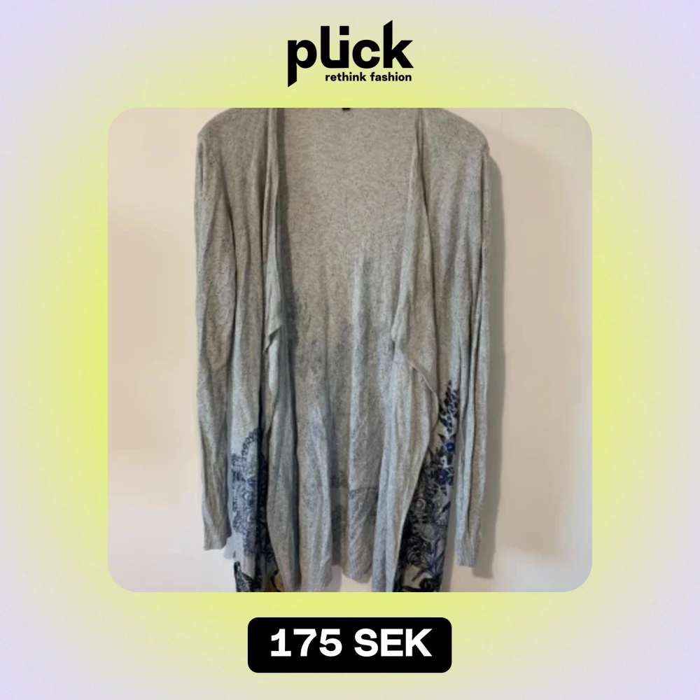 En grå stickad kofta med ett mönster av blommor och fjärilar på ena sidan. Den har en asymmetrisk design med en längre sida i ryggen. Skick: Mycket bra Längd: 101cm