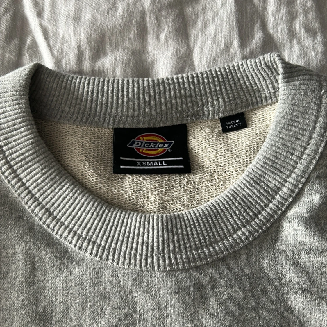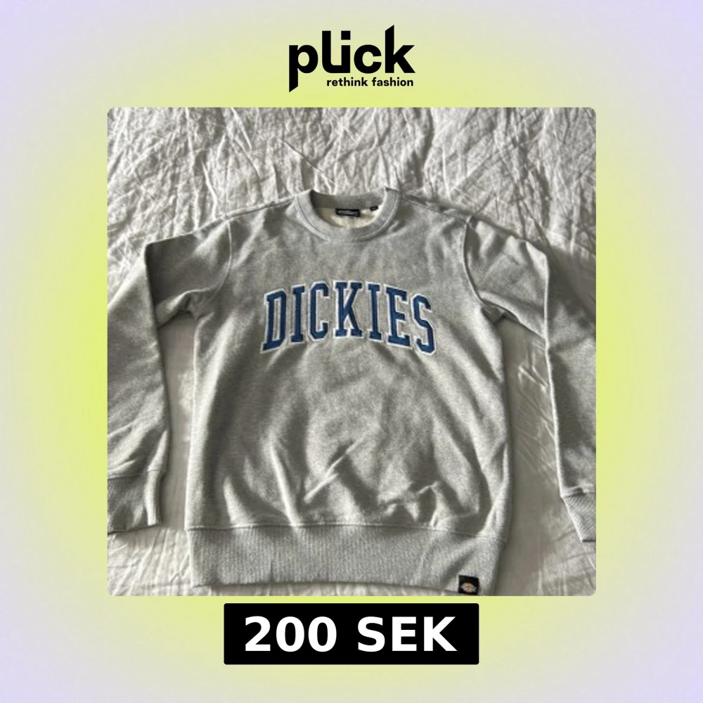 Säljer en klassisk grå sweatshirt från Dickies med blå och vit logga tryckt över bröstet. Tröjan har rund halsringning, ribbade muddar och är tillverkad i mjuk bomullsblandning. Perfekt för en avslappnad stil. Ganska stor is storleken men passar mer som S/M
