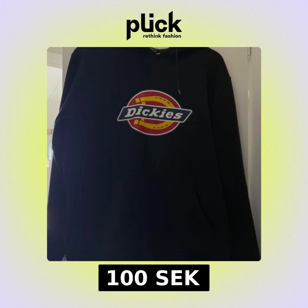 Säljer en svart hoodie från Dickies med deras ikoniska logga i rött och gult på bröstet. Tröjan har en klassisk passform med långa ärmar och en praktisk känguruficka framtill. Perfekt för en avslappnad stil.