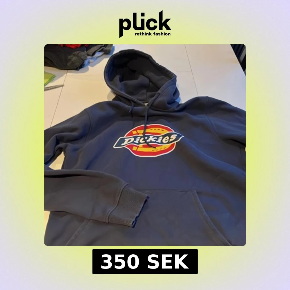 Säljer en snygg mörkblå hoodie från Dickies med det klassiska logotyptrycket på bröstet. Hoodien har en stor ficka framtill och justerbar huva med dragsko. Perfekt för en avslappnad stil.