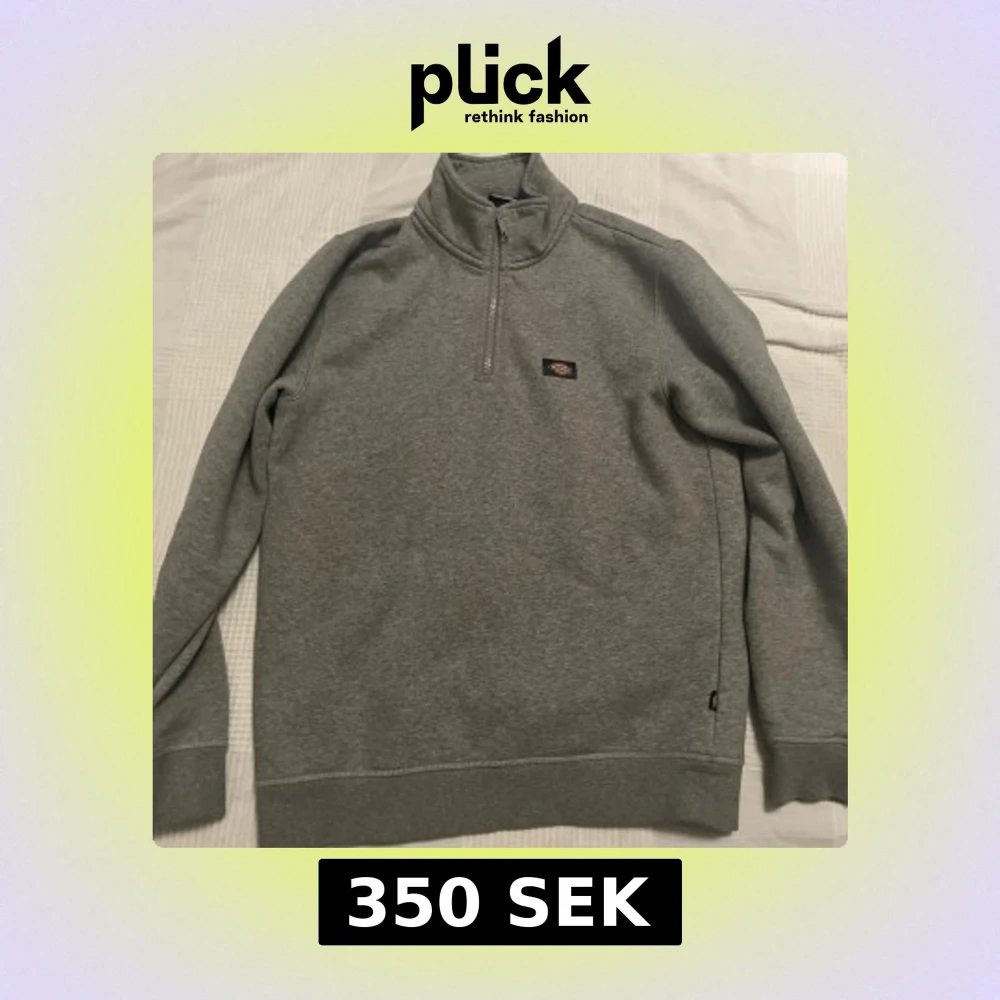 Säljer en grå långärmad tröja från Dickies i storlek small. Tröjan har en hög krage med half zip och liten logga på bröstet. Tillverkad i mjuk bomullsmix, perfekt för chill dagar eller när du vill ha en enkel och clean look.
