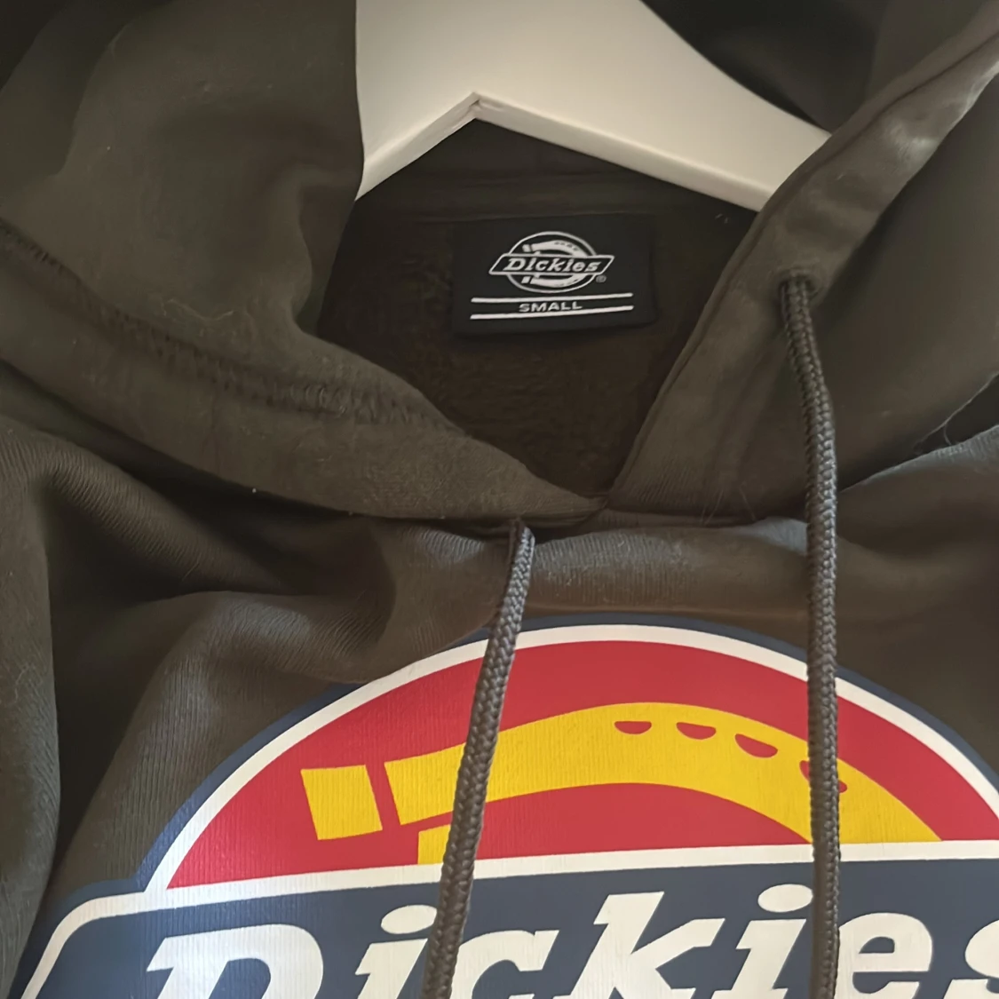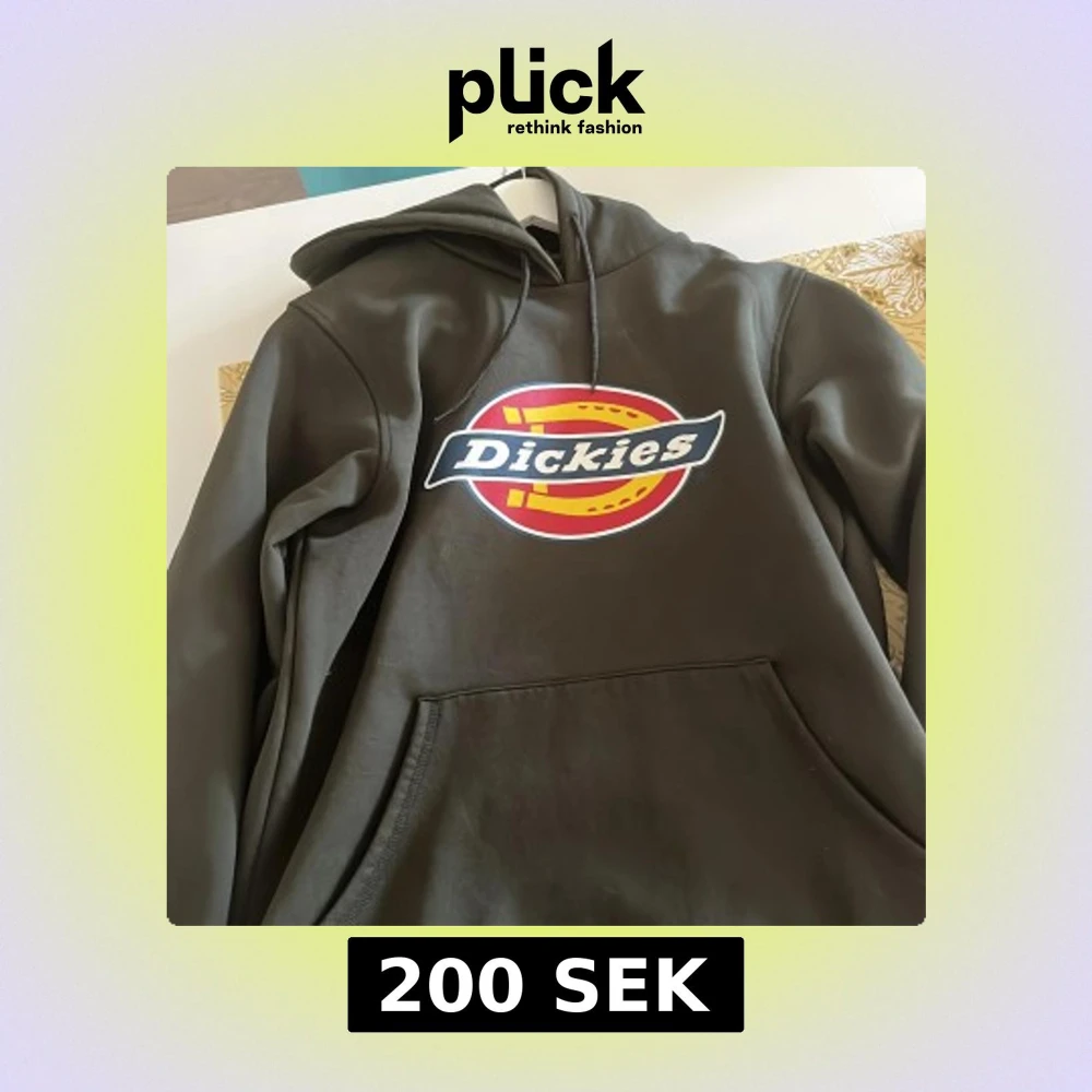 Säljer en svart hoodie från Dickies i storlek small. Tröjan har stor färgglad Dickies-logga på bröstet, huva med snörning och en klassisk känguruficka framtill. Perfekt för dig som gillar streetwear och vill ha en bekväm och snygg look.