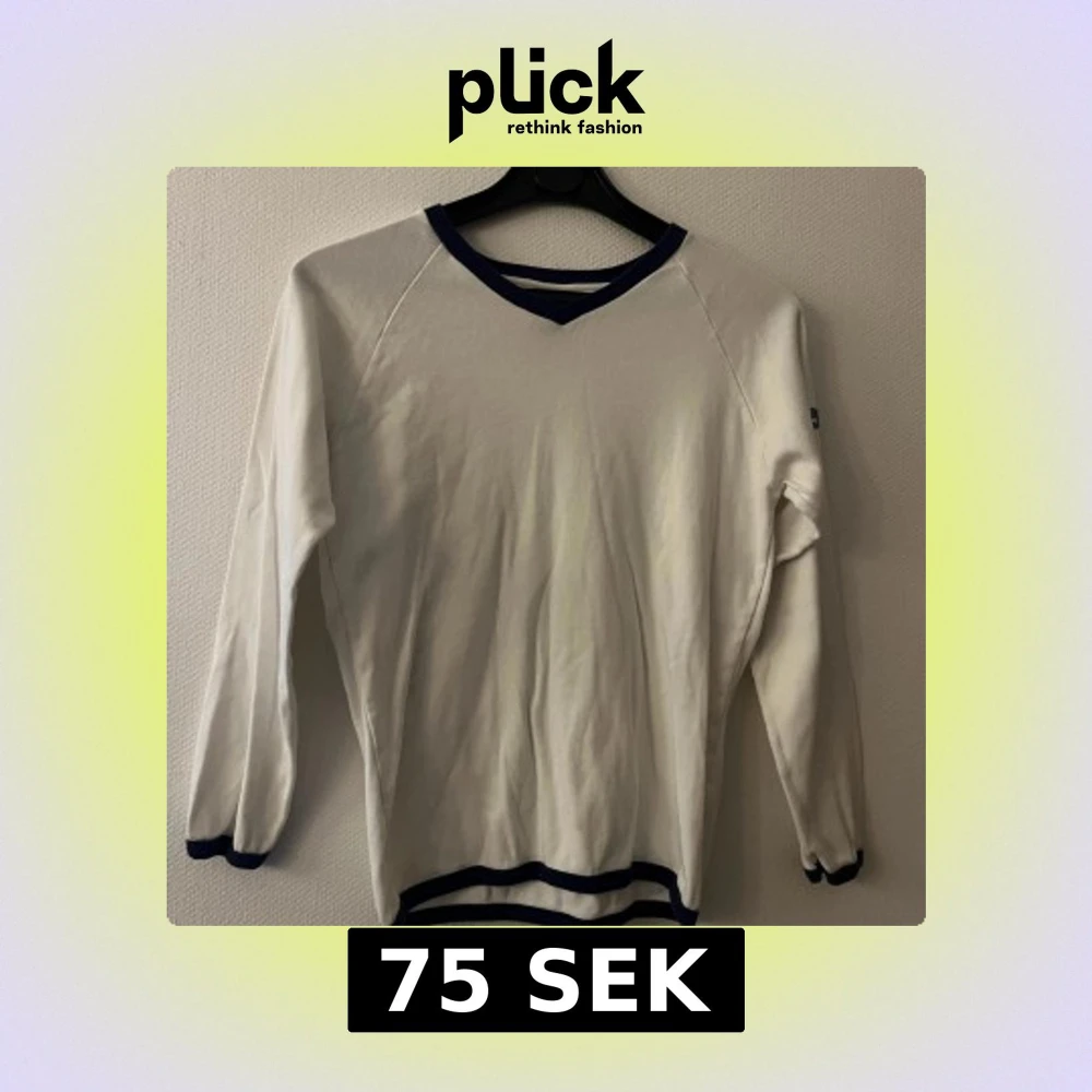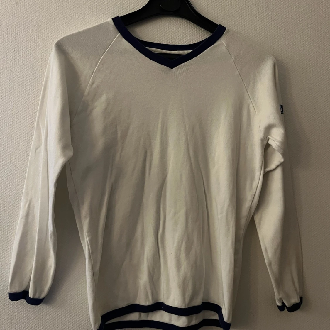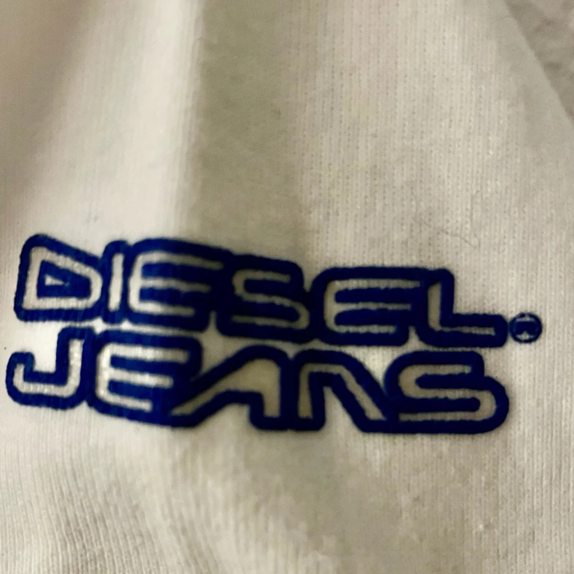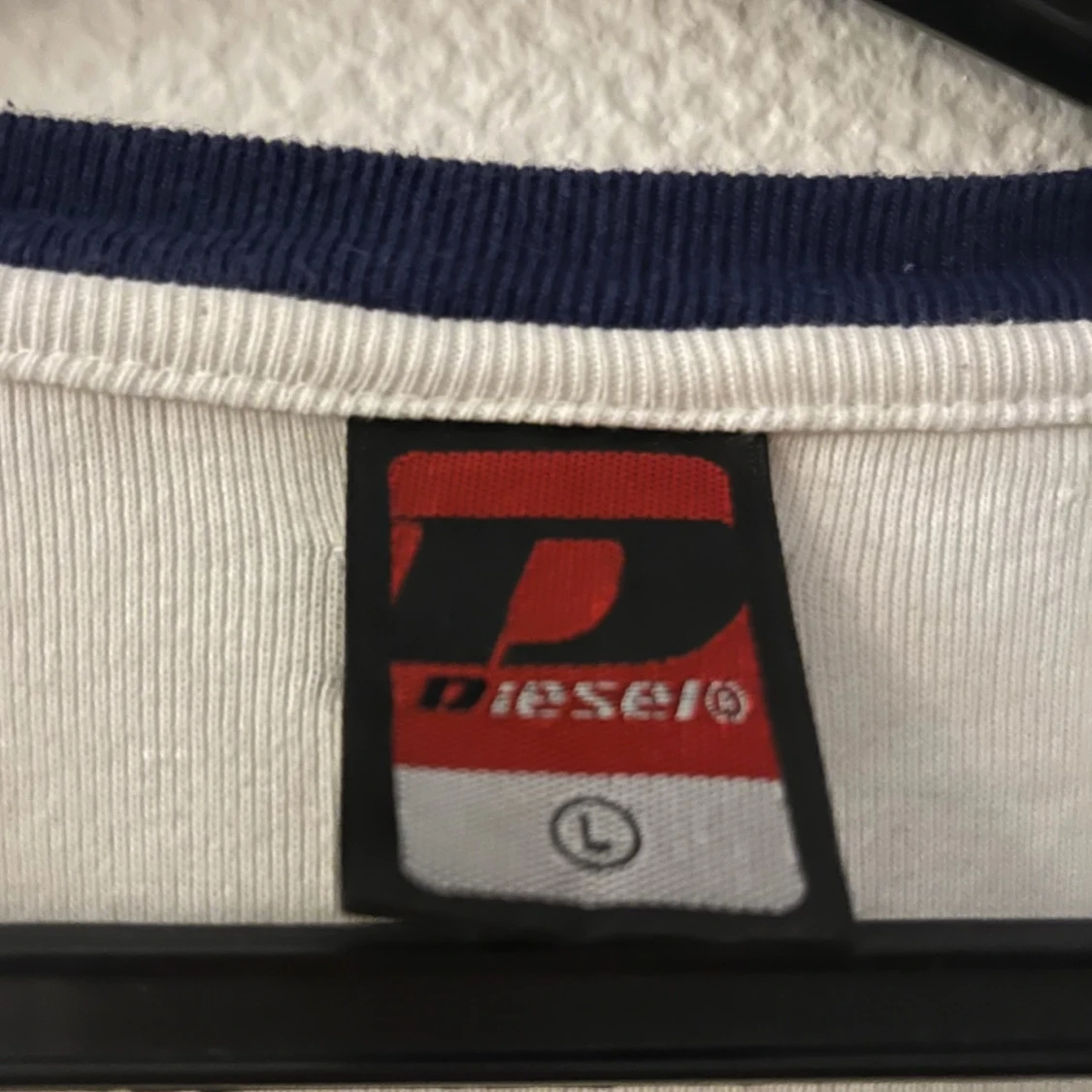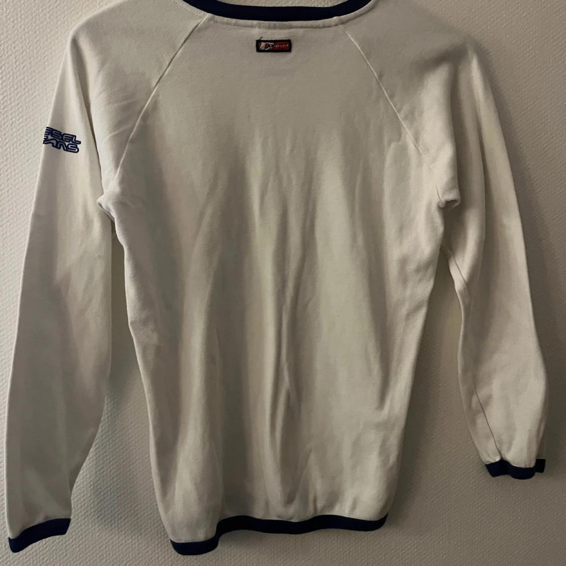Vit långärmad tröja från Diesel Jeans med blåa detaljer vid hals, ärmslut och nederkant. Tröjan har en klassisk passform och är tillverkad i mjukt bomullsmaterial. Diesel Jeans-logga i blått på ärmen. Storlek L men liten i storleken