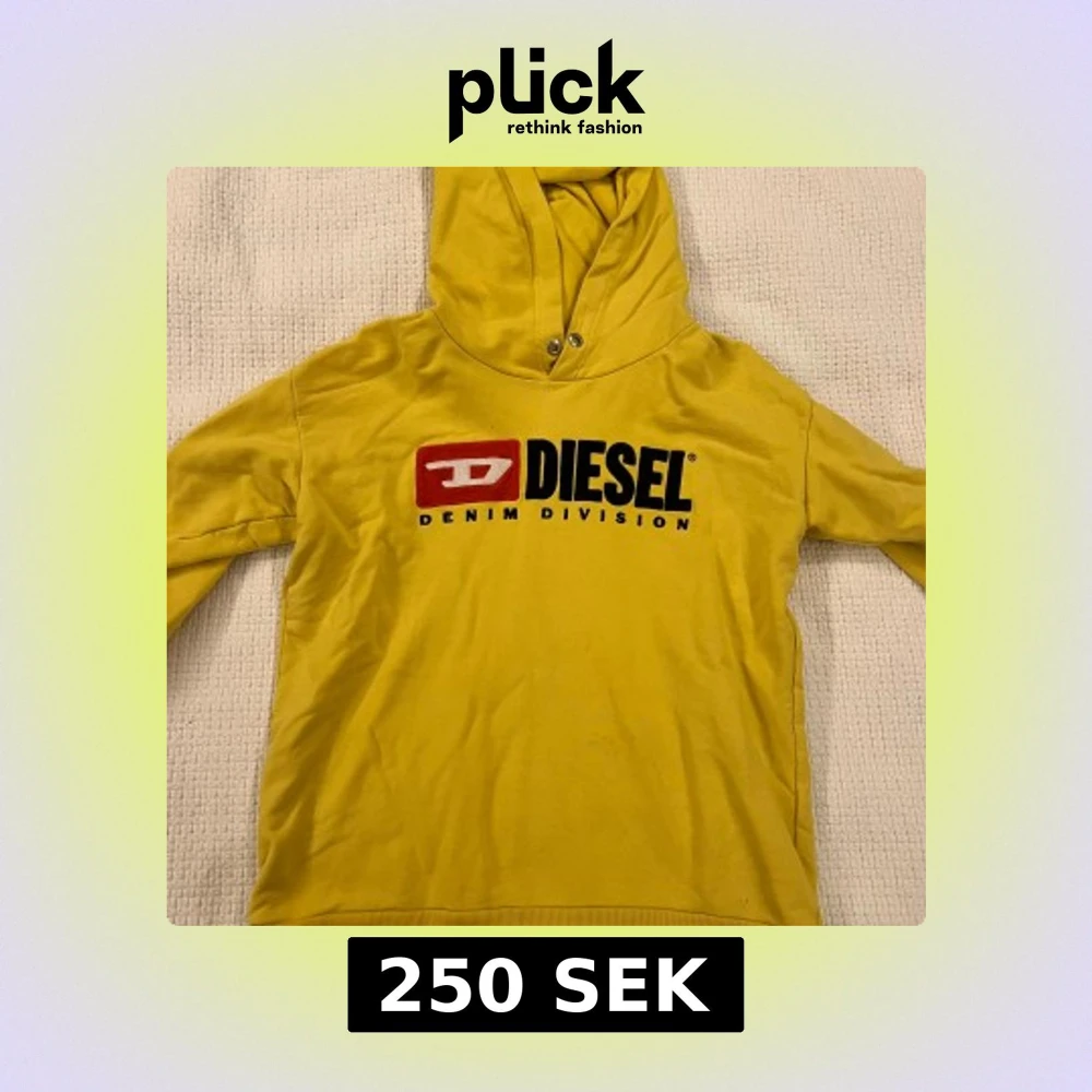 Gul hoodie från Diesel med stor broderad logga och texten 'Denim Division' på bröstet. Tröjan har huva med metallöljetter och långa ärmar. Tillverkad i mjuk bomull, perfekt för en avslappnad streetstyle-look.