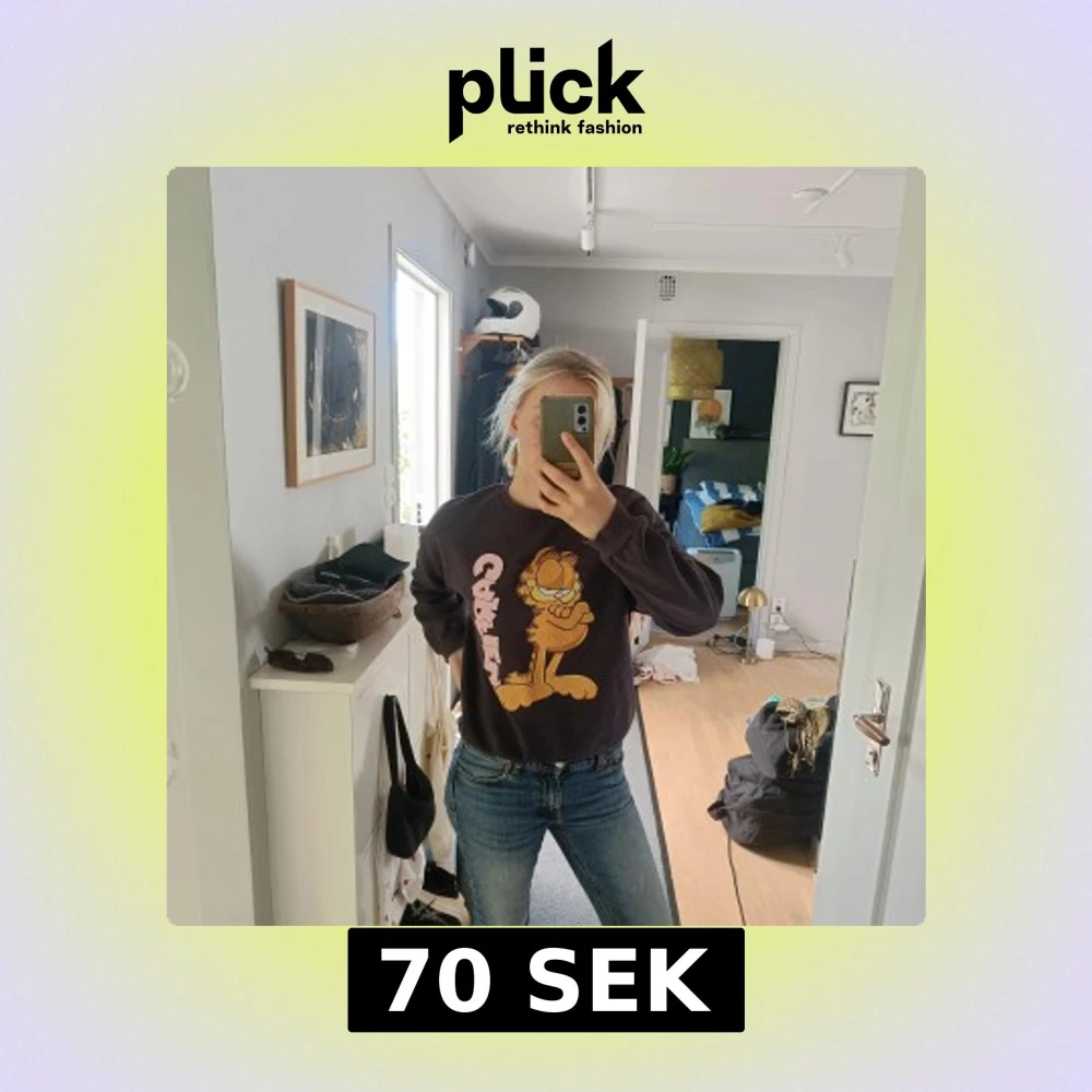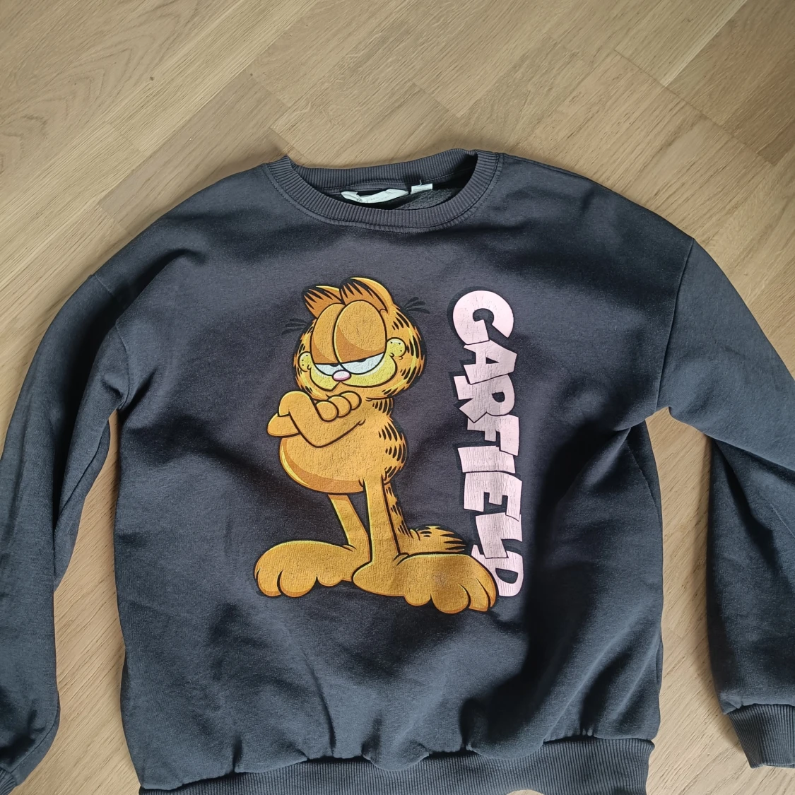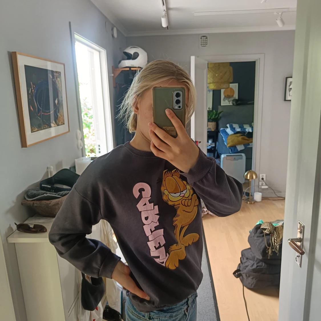 Snygg mörkgrå sweatshirt med stort tryck av Garfield och rosa text på framsidan. Rund hals, ribbade muddar och långärmad. Mjuk och skön bomullsmix som passar till jeans eller chill-outfit.
