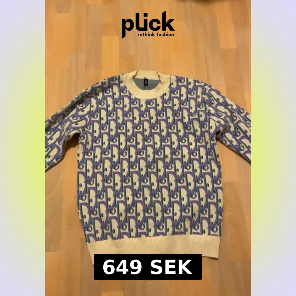 Unik stickad tröja från Dlor med ett grafiskt mönster i lila, grönt och vitt. Tröjan har rund hals, ribbade muddar och nederkant. Perfekt för dig som gillar färg och vill sticka ut lite extra.