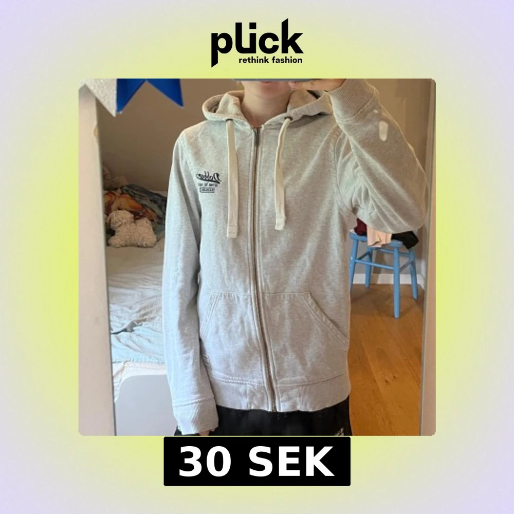 Säljer en ljusgrå hoodie från Dobber med dragkedja och huva. Tröjan har vita snören, två fickor framtill och broderad logga på bröstet. Perfekt för chill dagar och enkel att matcha med det mesta. Den har en liten fläck fram på fickan vet ej om den går bort i tvätten