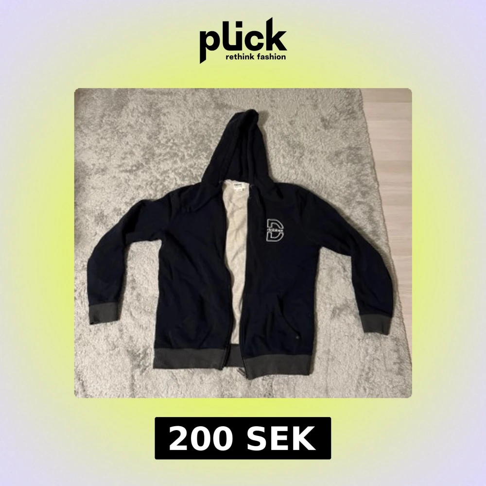 Snygg mörkblå hoodie från Dobber i storlek medium. Tröjan har huva med snörning, dragkedja framtill och två fickor. Ribbstickade muddar vid ärmslut och nederkant. Stor D-logga på bröstet ger en cool streetkänsla.