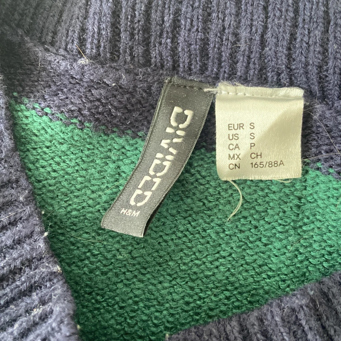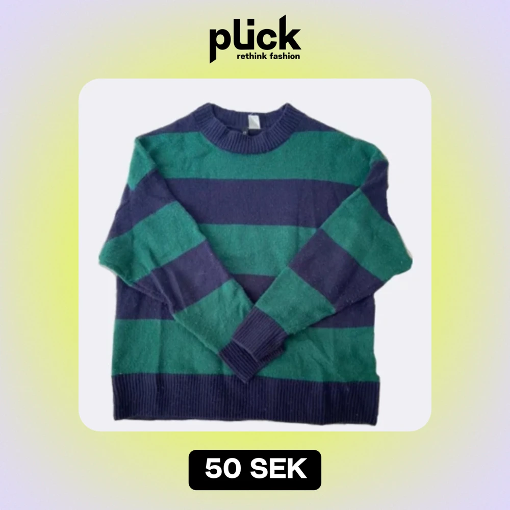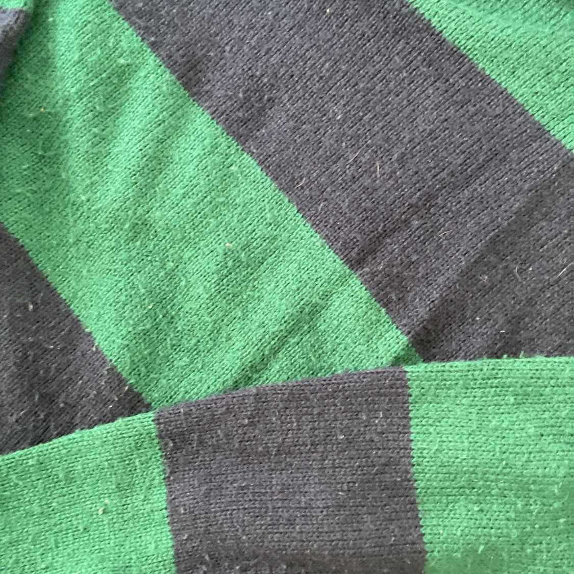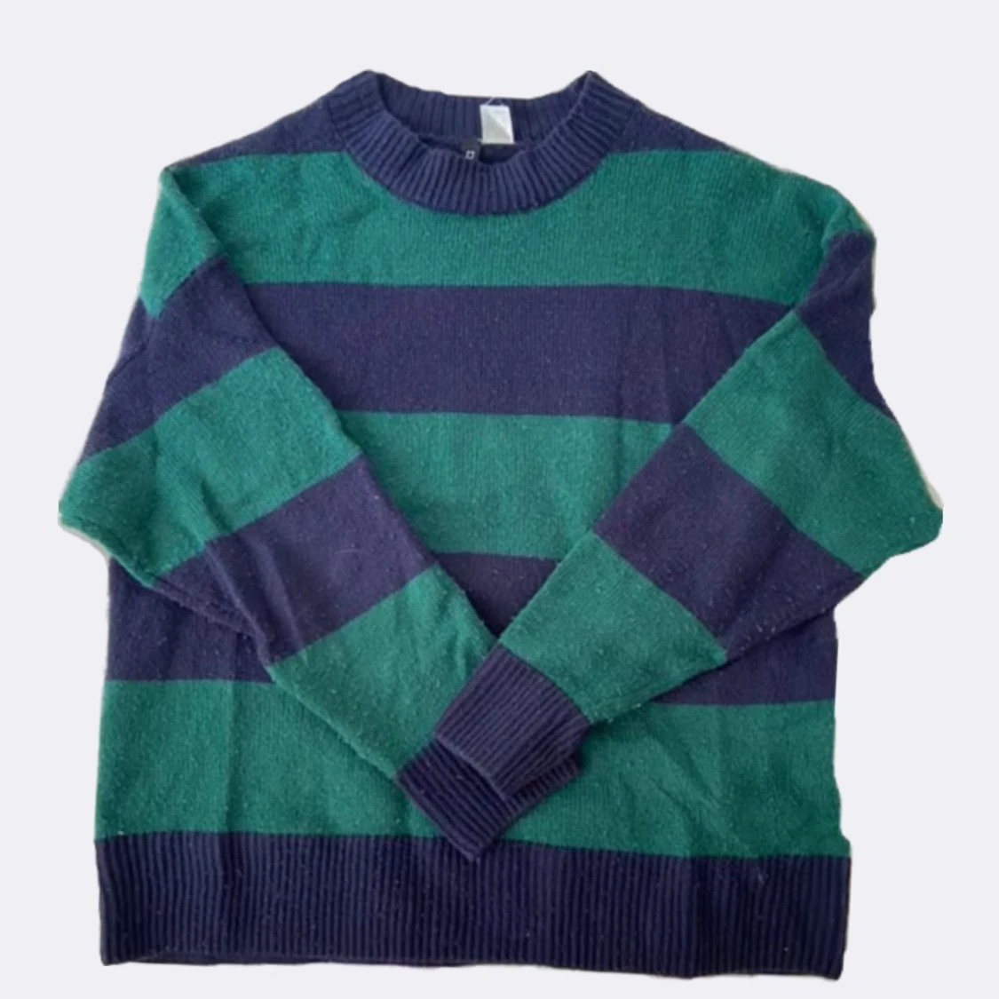 Randig stickat tröja i grönt o mörkblått, på bilden ser det svart ut men det är blå. Ganska nopprig men kommer av noppras innan den fraktas🎀🐒