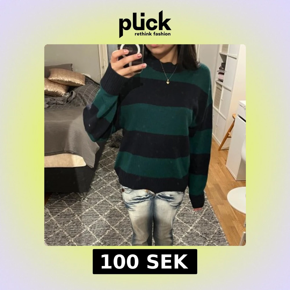 Säljer en mysig randig tröja i grönt och svart med långa ärmar. Perfekt för kyligare dagar. Tröjan har en avslappnad passform och är skön att bära.
