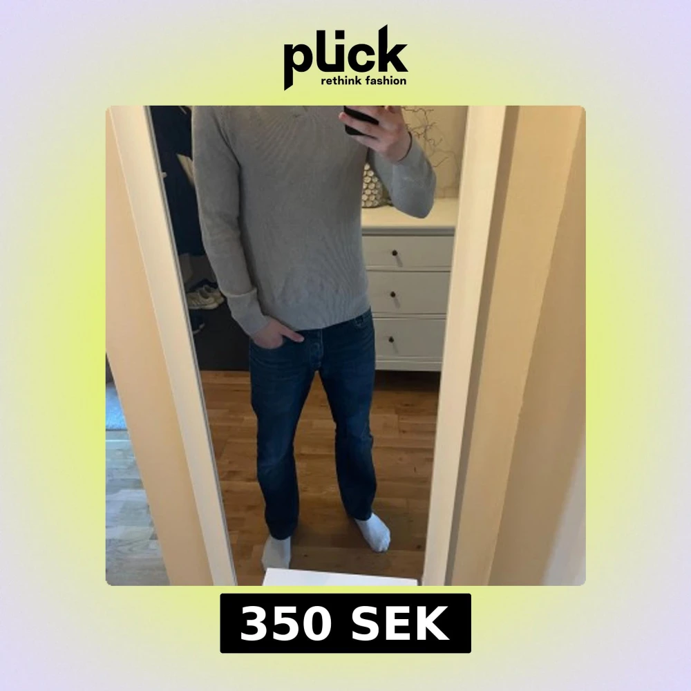 Säljer en stilren beige ribbad tröja från Dressmann. Tröjan har en klassisk krage och långa ärmar, perfekt för en avslappnad men ändå snygg look. Storlek M
