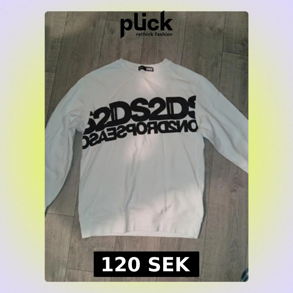 Säljer en vit sweatshirt från DS2 med stort svart grafiskt tryck över bröstet. Tröjan har rund halsringning och långa ärmar. Perfekt för dig som gillar streetwear och vill sticka ut med en unik design.