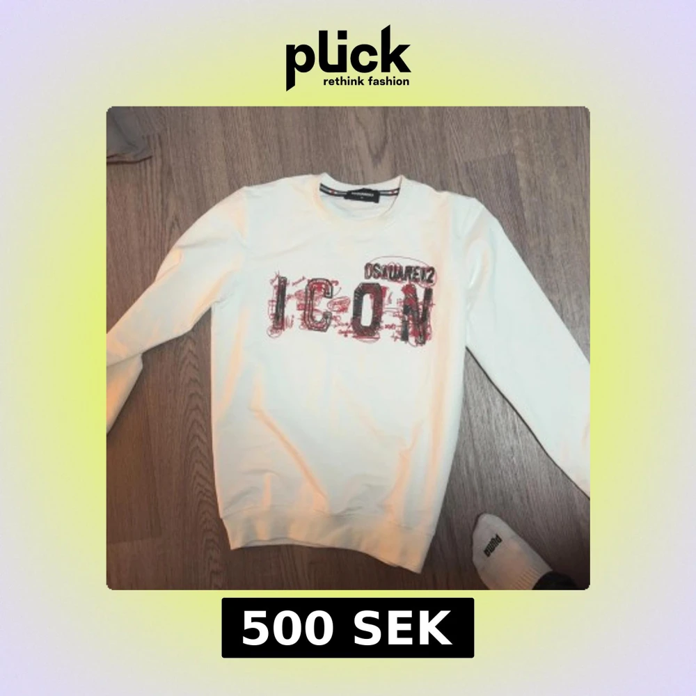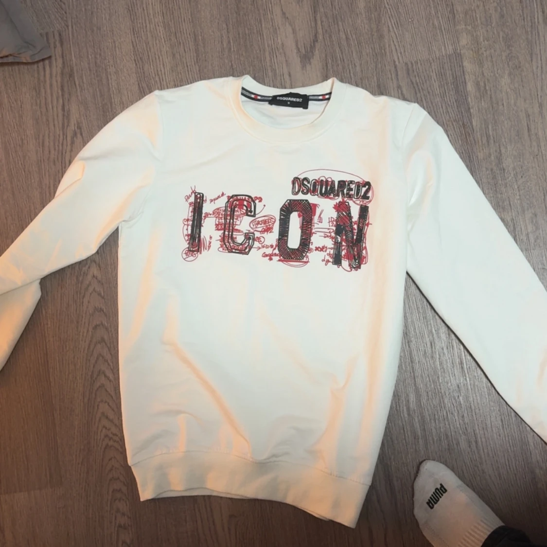 Vit sweatshirt från Dsquared2 med stort 'ICON'-tryck i svart och rött framtill. Tröjan har rund halsringning, långa ärmar och ribbade muddar. Perfekt statement-plagg för dig som gillar streetstyle och vill sticka ut.
