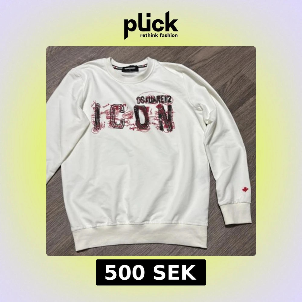 Vit sweatshirt från Dsquared2 med stor svart och röd 'ICON'-logga framtill och liten röd lönnlöv-detalj på ärmen. Klassisk rund halsringning och ribbade muddar. Perfekt för dig som gillar streetstyle och vill sticka ut med en snygg logga.