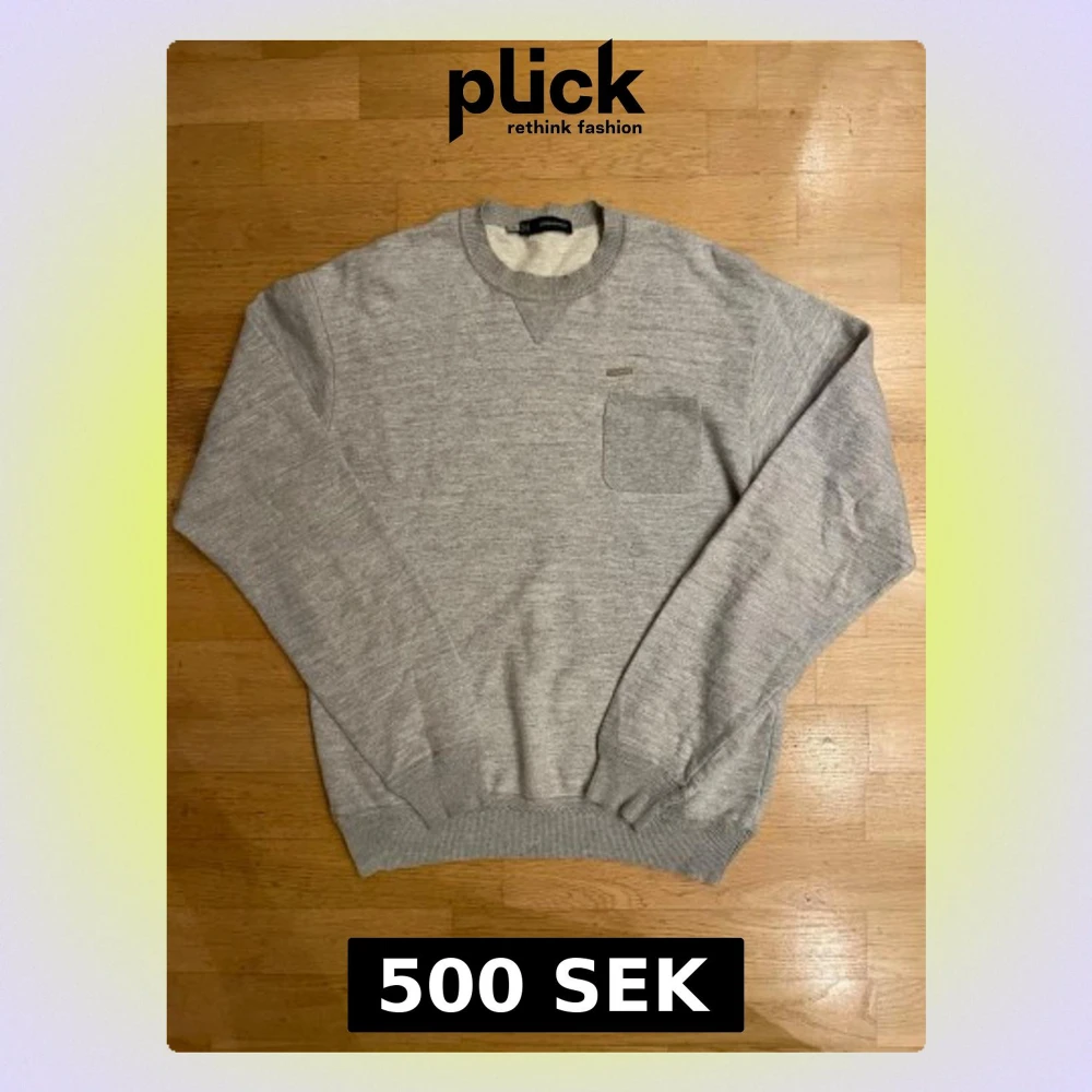 Säljer en stilren grå stickad tröja från Dsquared2, tillverkad i Italien. Tröjan har rund hals, ribbade muddar och en liten bröstficka med metallmärke. Perfekt för dig som gillar enkel och snygg design.