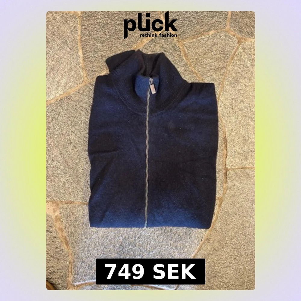 Mörkblå tröja i 100% kahsmir, den har en hel dragkedja framtill och hög krage. Passar perfekt för lager på lager. Som man ser på bilderna så är de hål i båda armhålorna, samt ett i slutet av armen. Dessa ser man dock inte vid användning (kan skicka bild med den på om du vill). Nypris runt 2449, mitt pris: 749