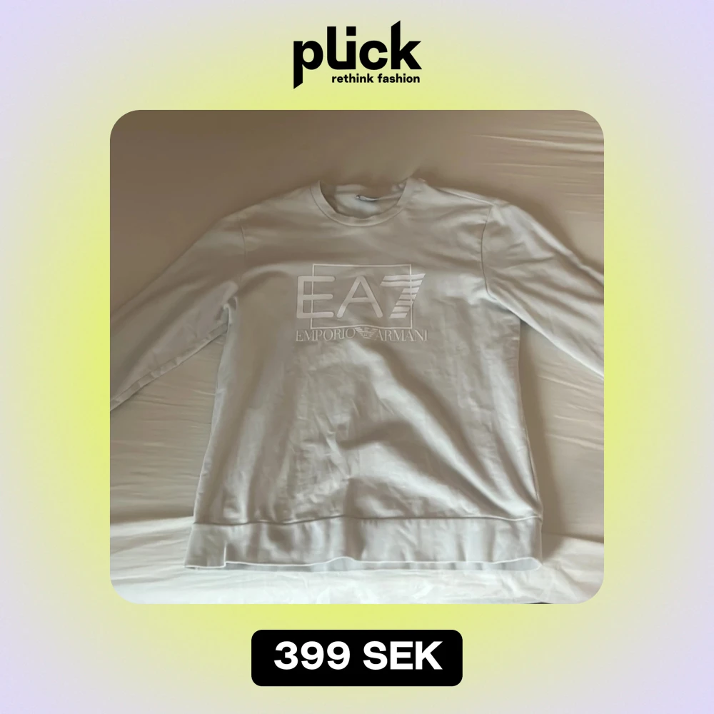 Säljer en stilren vit tröja från Emporio Armani med EA7-logga på framsidan. Tröjan är långärmad och perfekt för en casual look. Den är i bra skick och passar både till vardags och lite finare tillfällen. Storlek S.